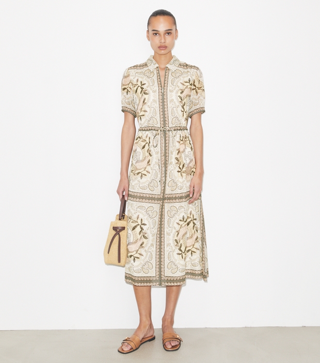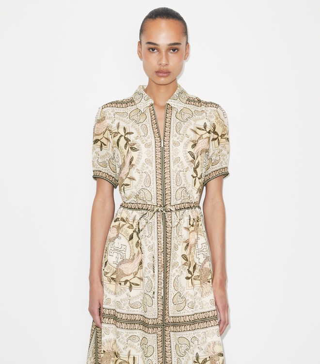 印花桑蚕丝前襟 T 恤连衣裙