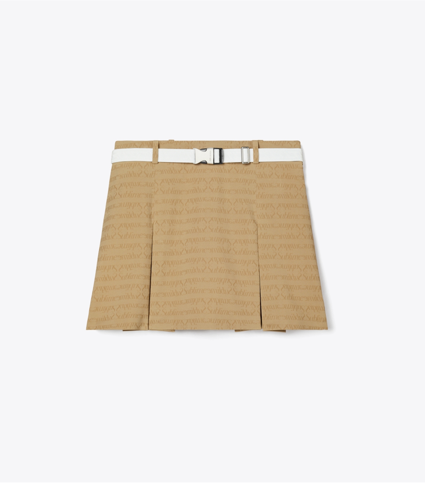 经典 A 字裙,精选面料,织有设计师Tory最为钟爱的词语图案,采用同色调工艺精编而成。并配有内搭短裤。腰带可灵活拆卸。