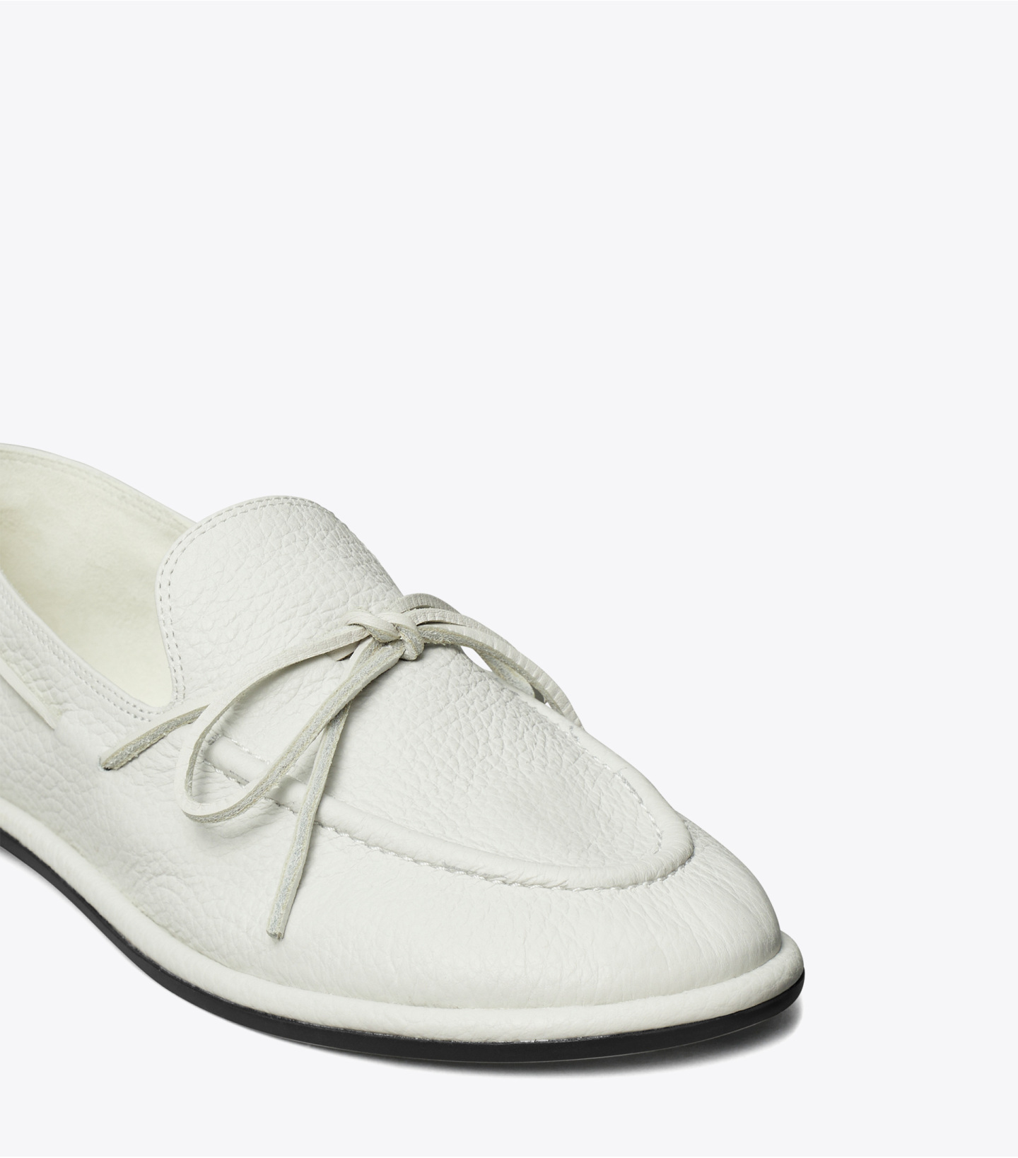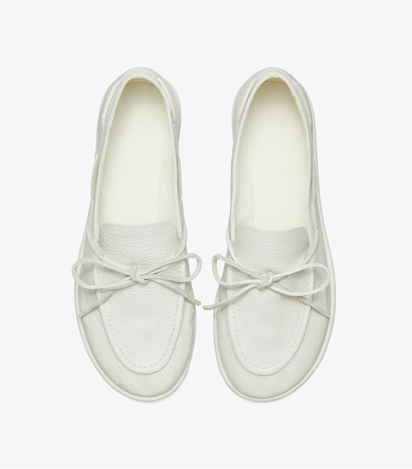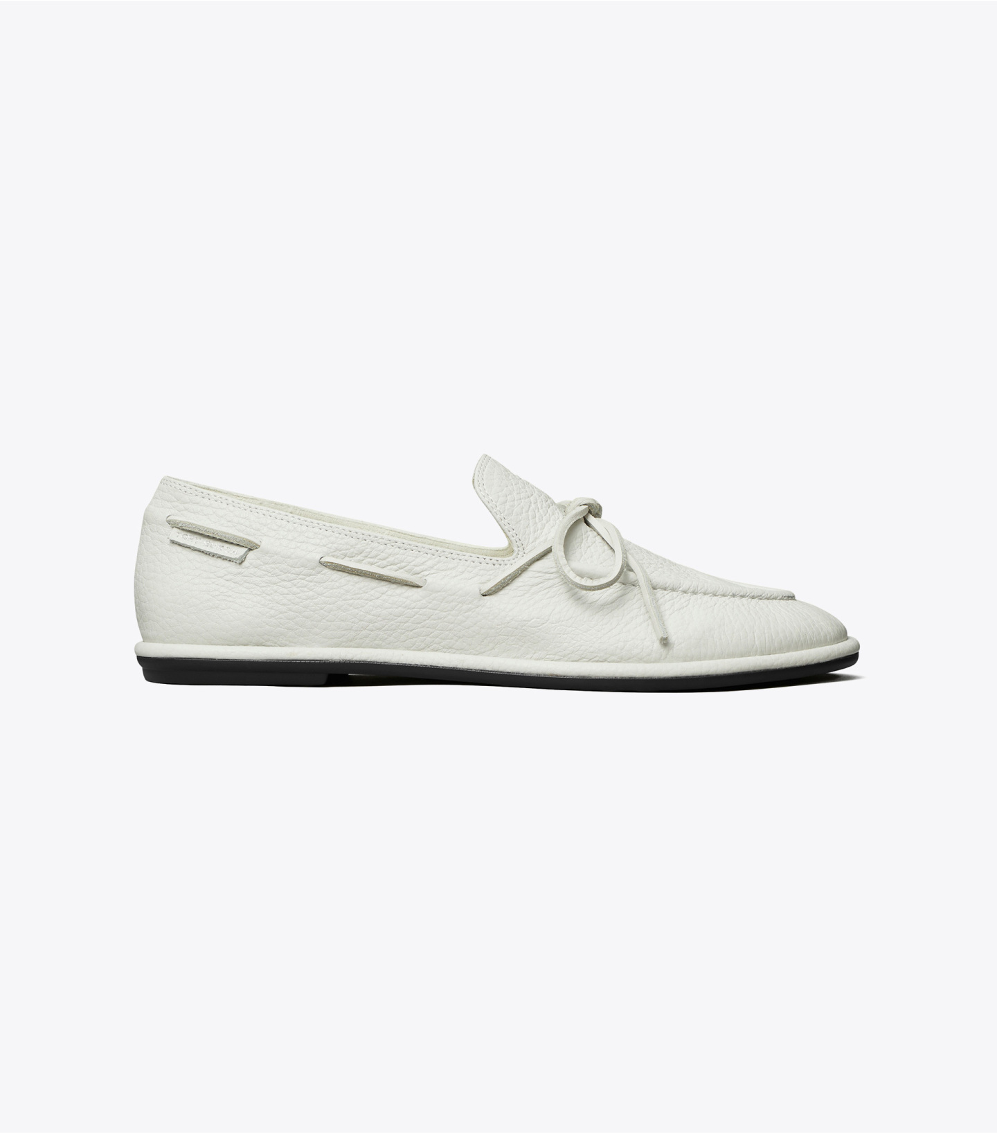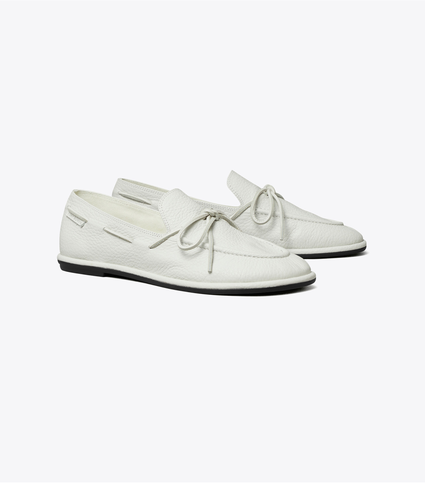 焕新演绎经典航海运动鞋,休闲不失精致感。这款船鞋采用仿乐福鞋廓形,配有圆滑鞋头、清晰顶部缝线和环绕式系带。鞋身精选皮革打造,奢华轻盈,加衬鞋垫带来舒适感,橡胶鞋底增加灵活性。可赤脚穿着或搭配袜子。