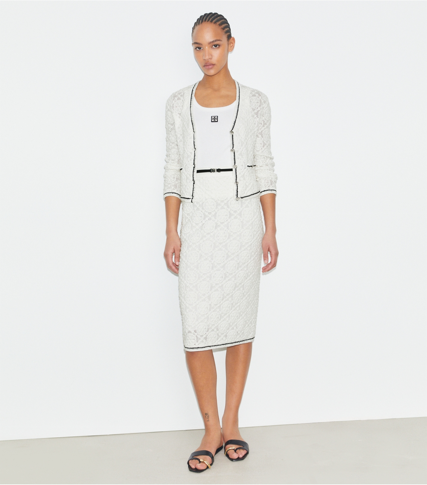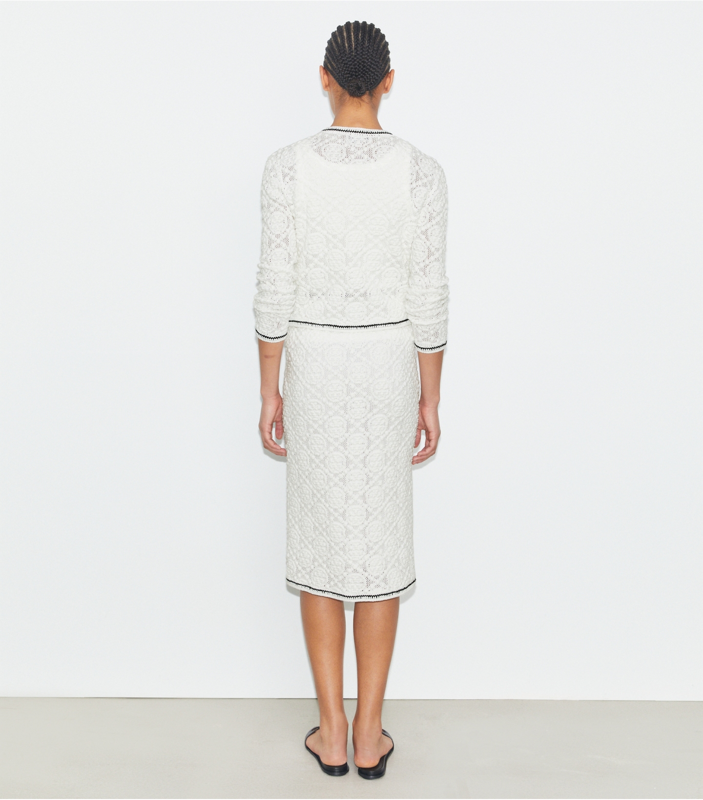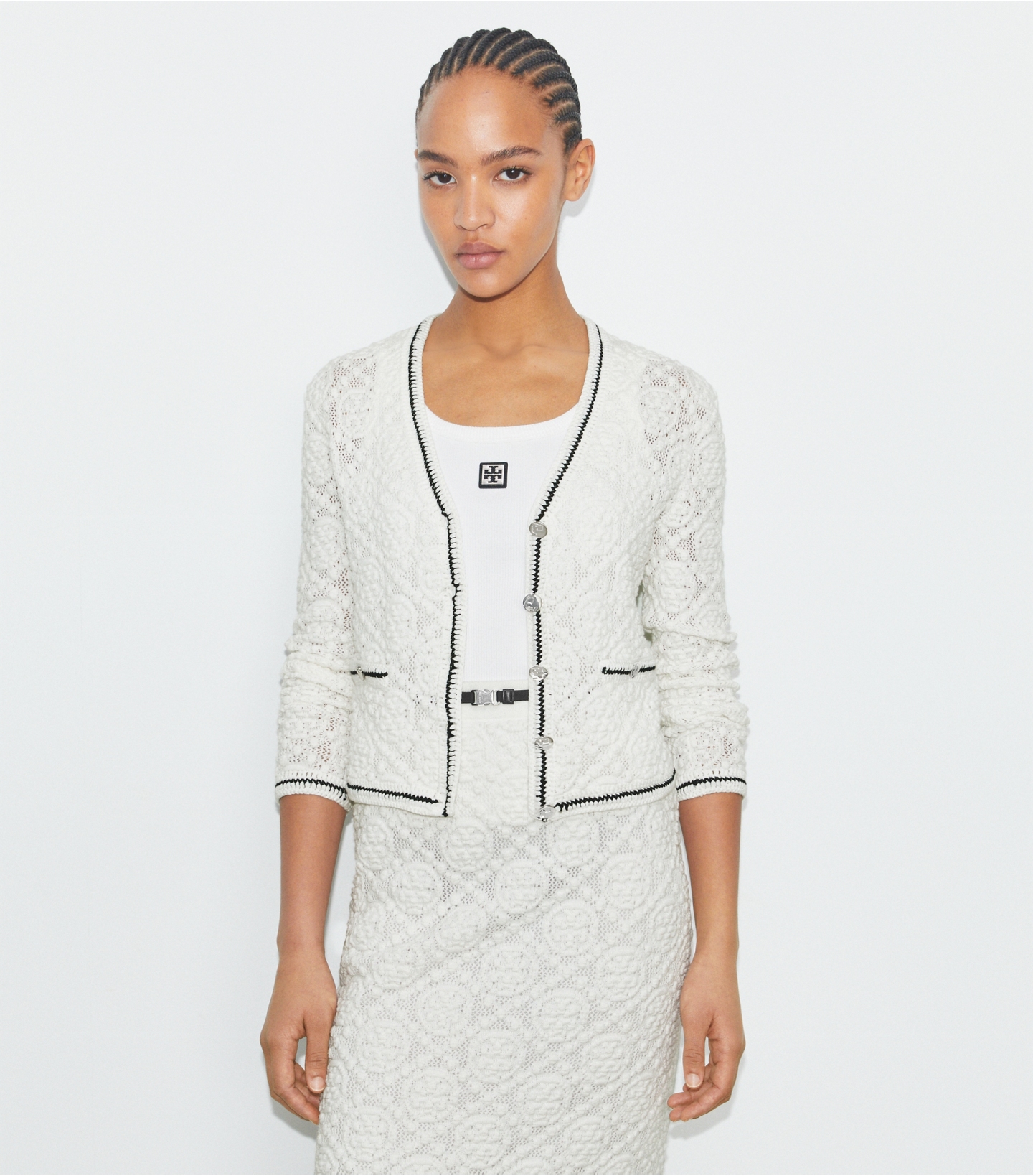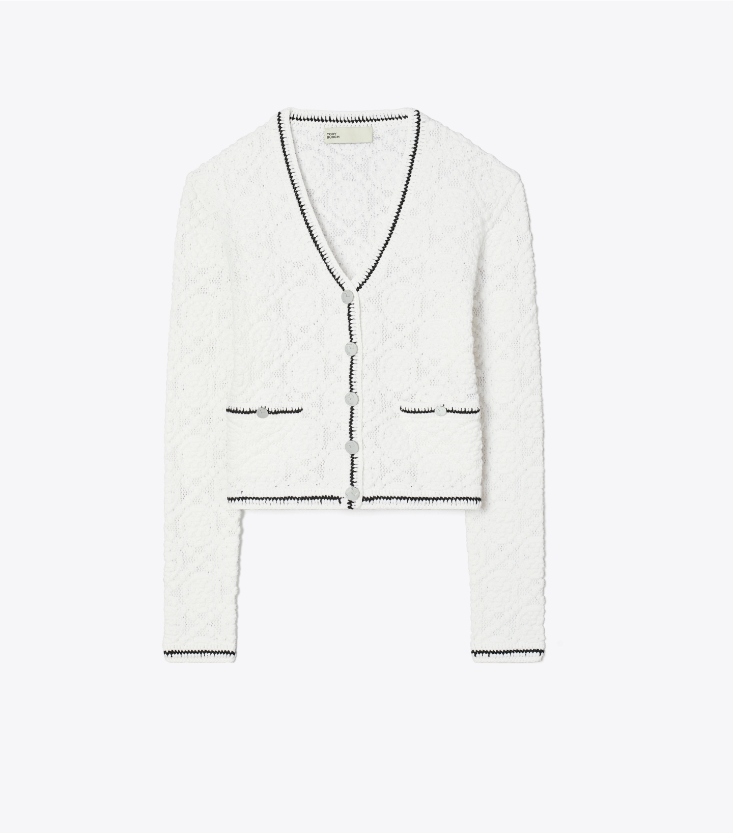 V 领开衫焕新升级,品牌标志性 T Monogram 图案巧妙融入蕾丝设计之中。配有撞色钩编饰边细节,轻盈时尚,可与本季 T 恤和连衣裙搭配穿着。