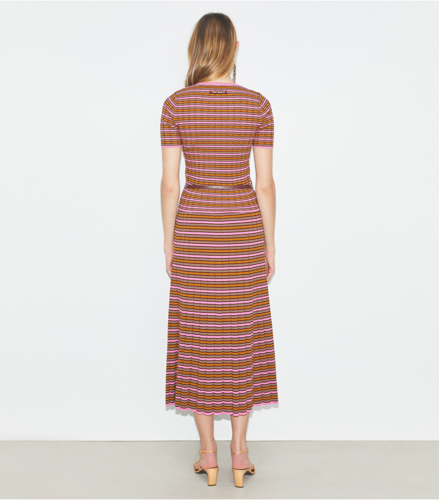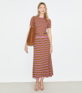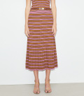 这款中长款半身裙,精选条纹针织制作,采用收腰放摆廓形,腰身处舒适贴合,裙摆随律动自然舒展。可搭配同款上衣,打造时尚造型。