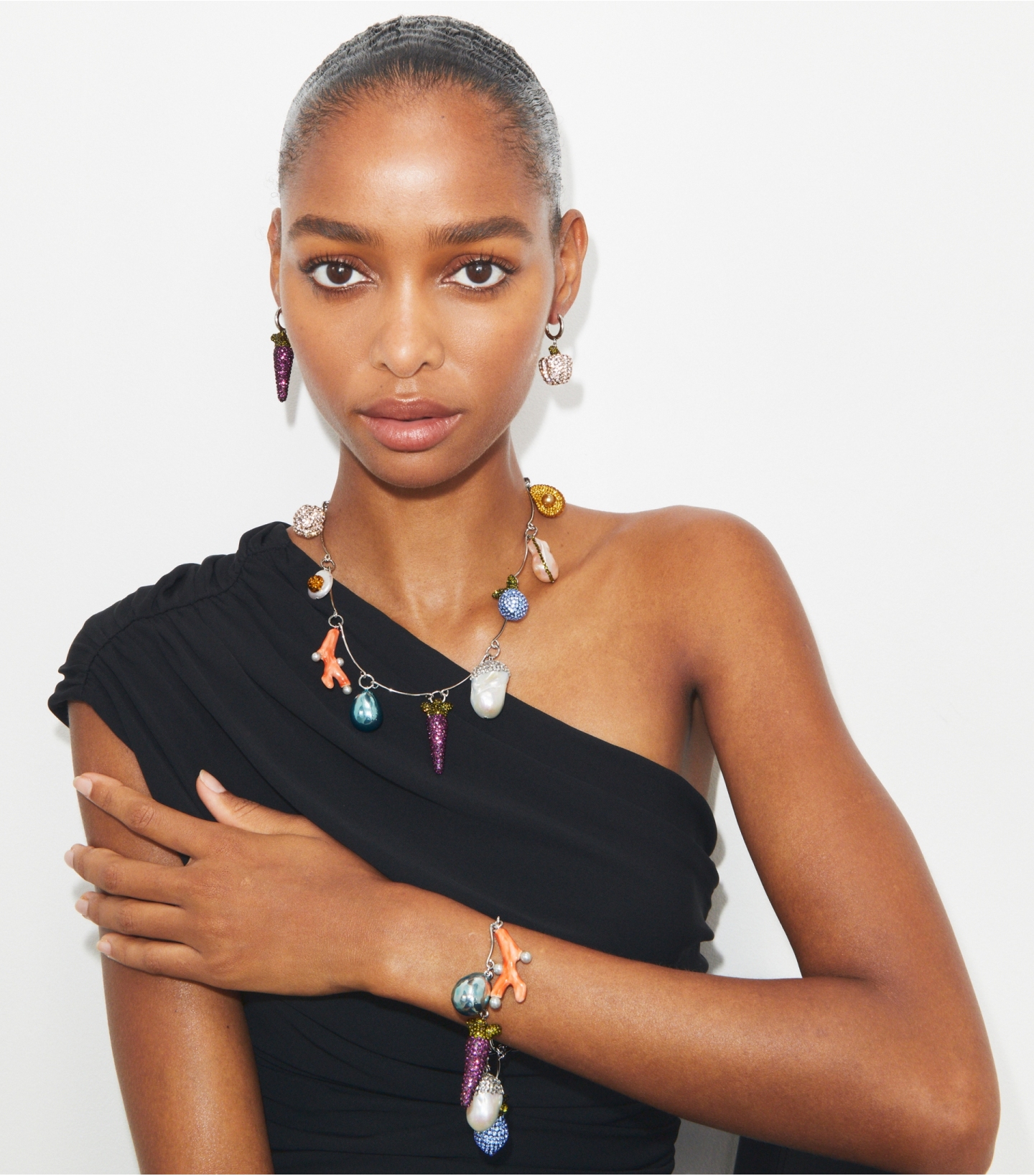 充满意外惊喜与不羁精神的珠宝盒裡,象征幸运的符号、奇趣生物,以及熟悉的日常物件,都焕发新意妙想。奇趣系列蔬菜造型耳环,质感轻盈。不对称设计的萝卜与甜椒吊坠。
