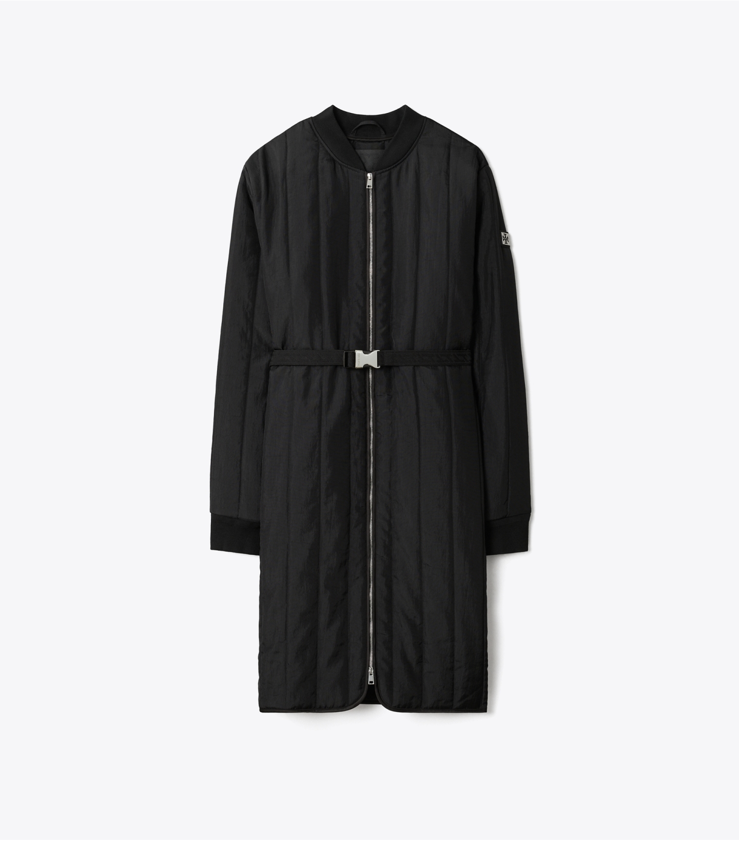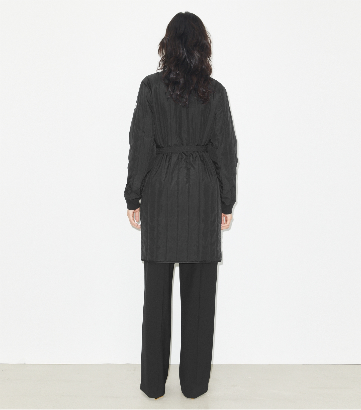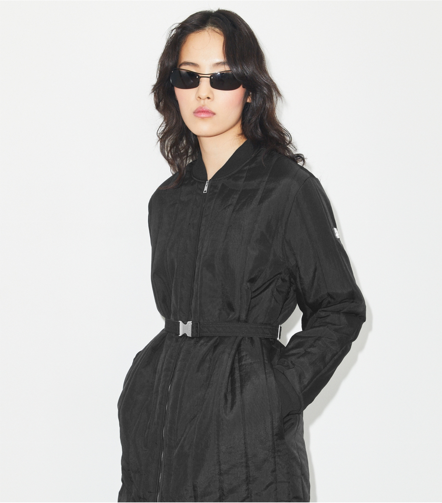 这款飞行员夹克,焕新演绎为及膝长款外套。采用宽松垂坠感剪裁和温暖绗缝结构。正面设有插手袋,配备全长双向拉链,可拆卸弹力腰带配有快速搭扣,增添运动时尚感。
