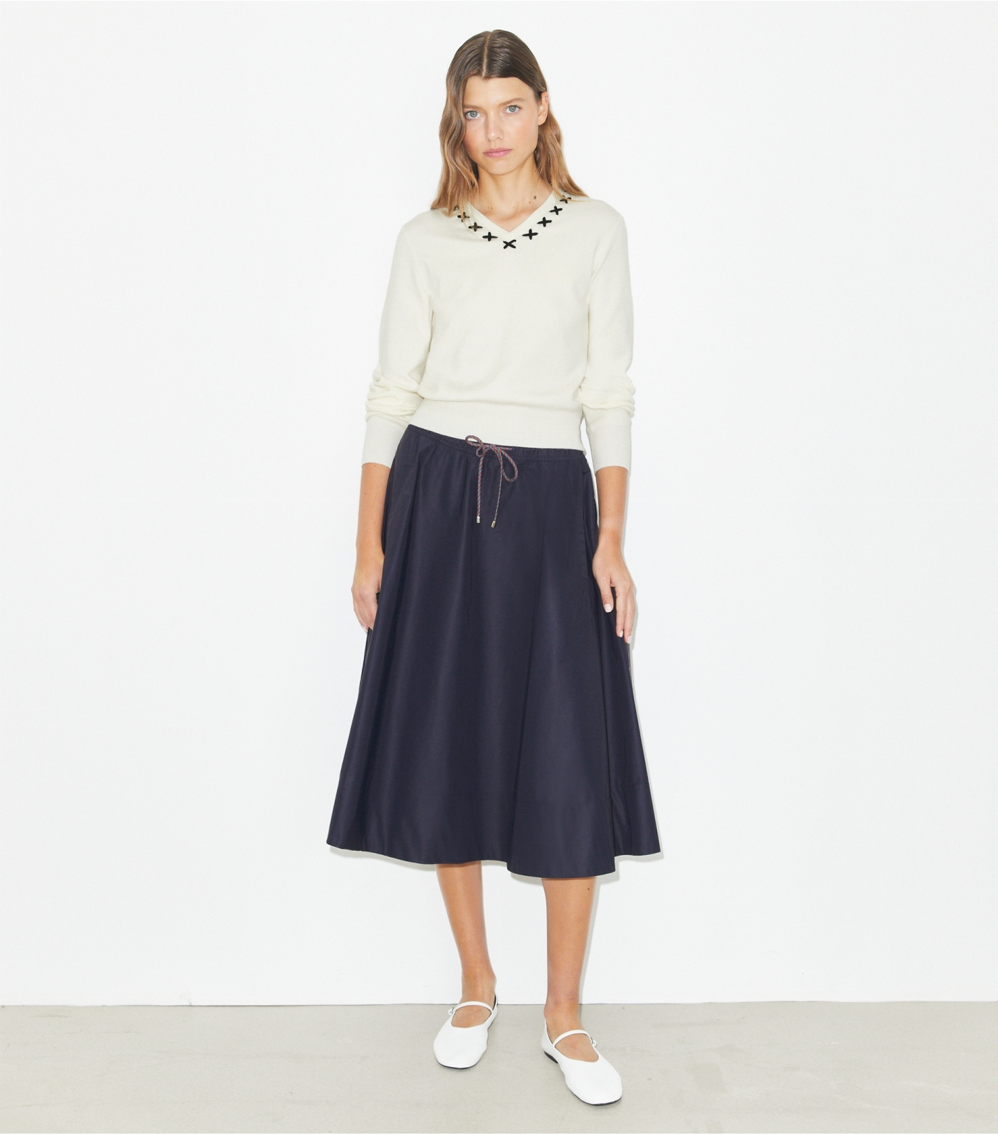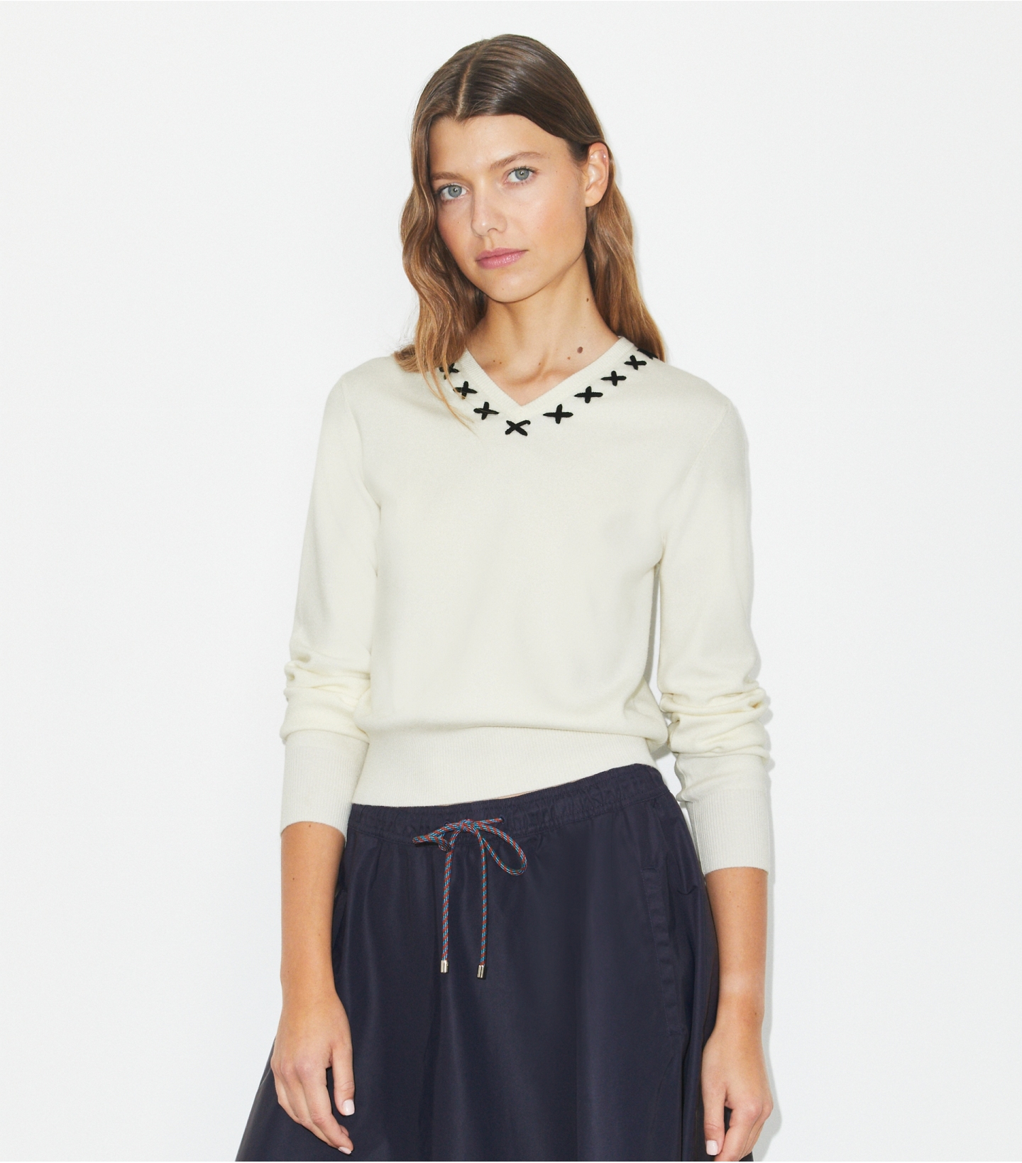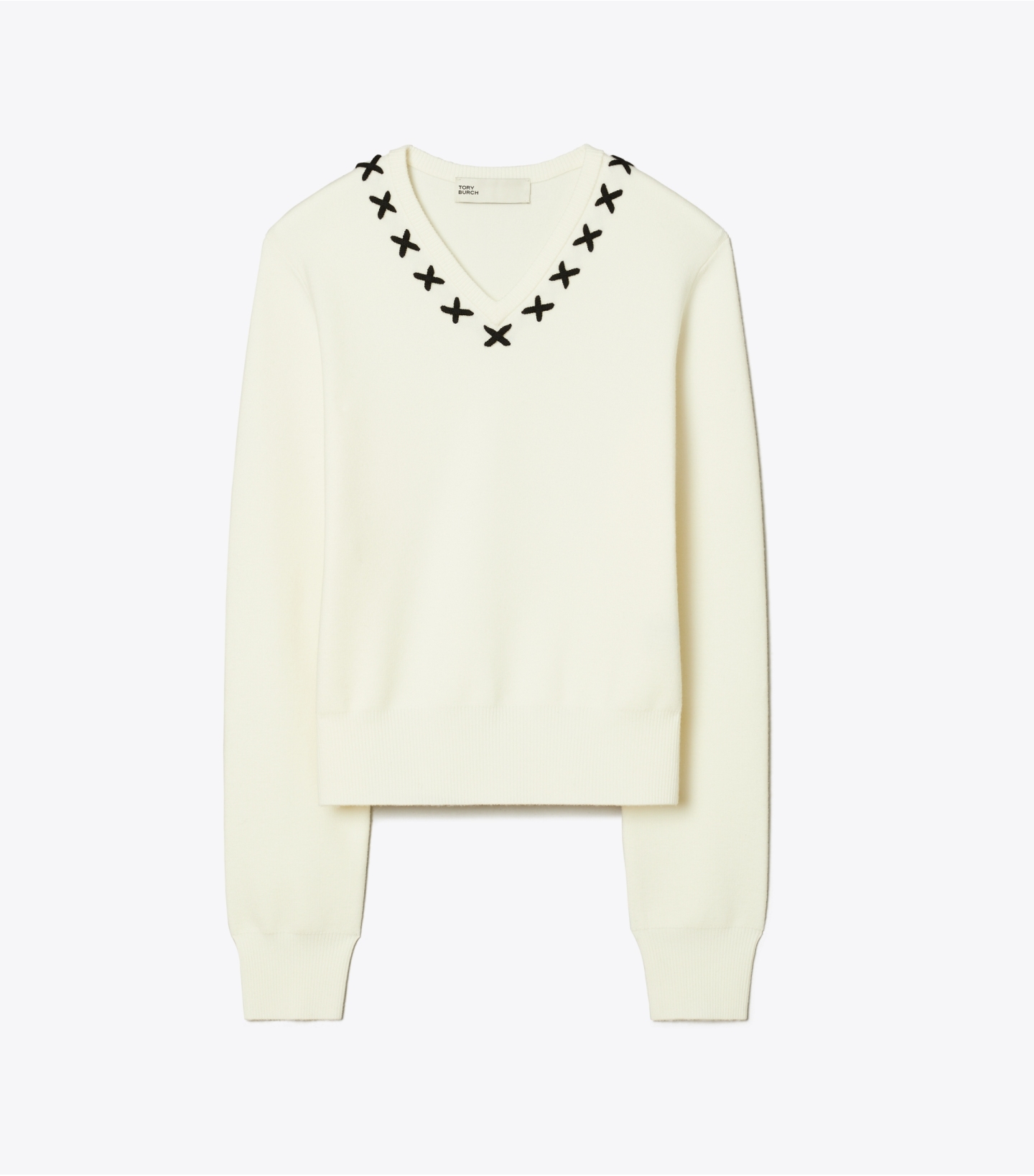 这款简约毛衣,精选温暖羊毛打造,采用修身剪裁,并饰有细腻图案。经典 V 领以 X 形刺绣勾勒轮廓。适合日常多场合穿着。
