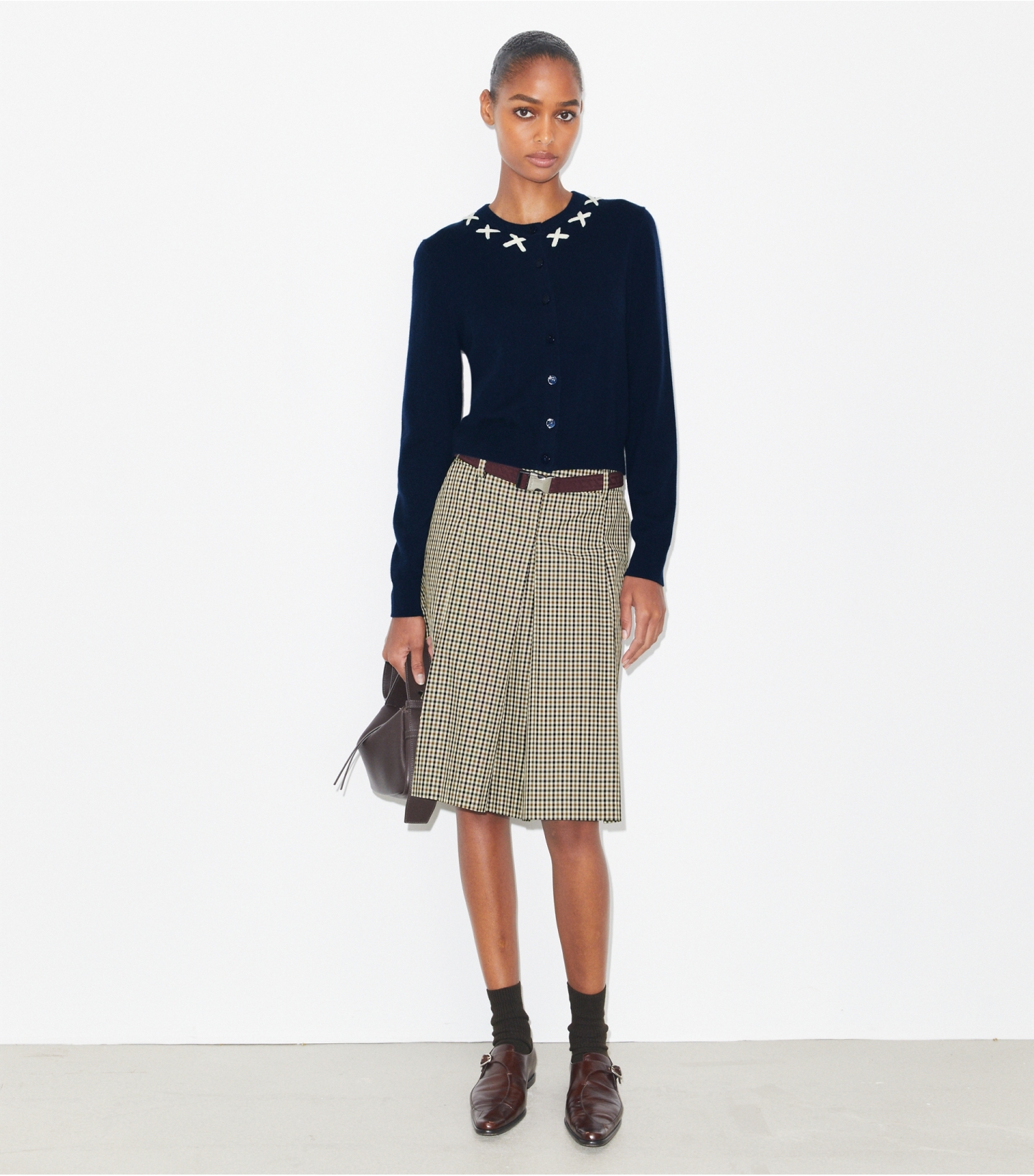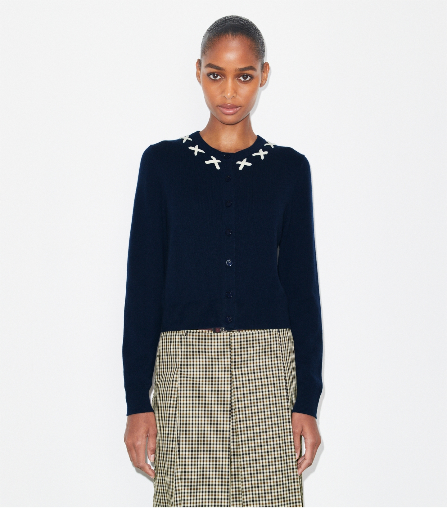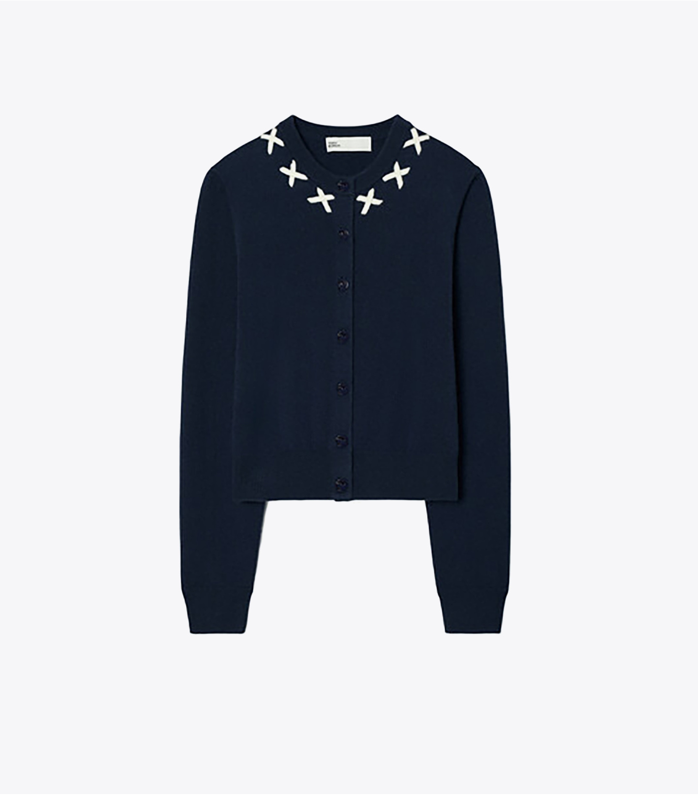 这款开衫精选柔软面料,领口饰有装饰性刺绣,结合恰到好处的微修身剪裁,适合多种搭配穿着。