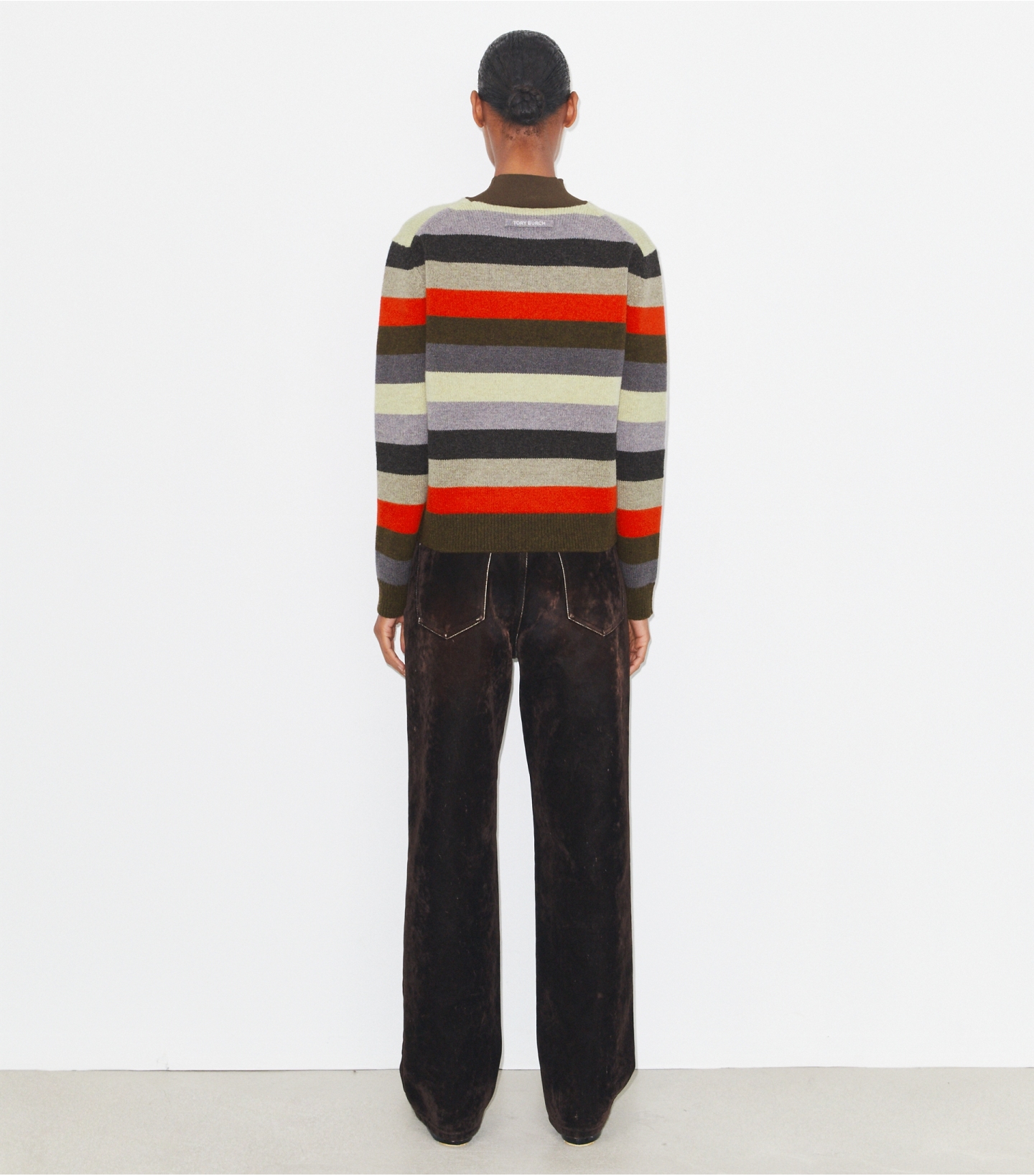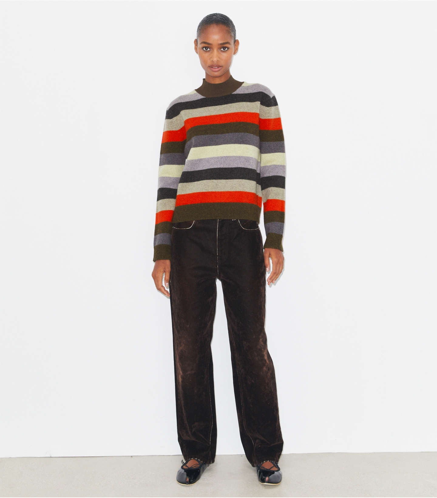 这款高领毛衣,精选纯羊毛面料而制,剪裁宽松,搭配暗色系条纹,是寒冷季节的必备单品。