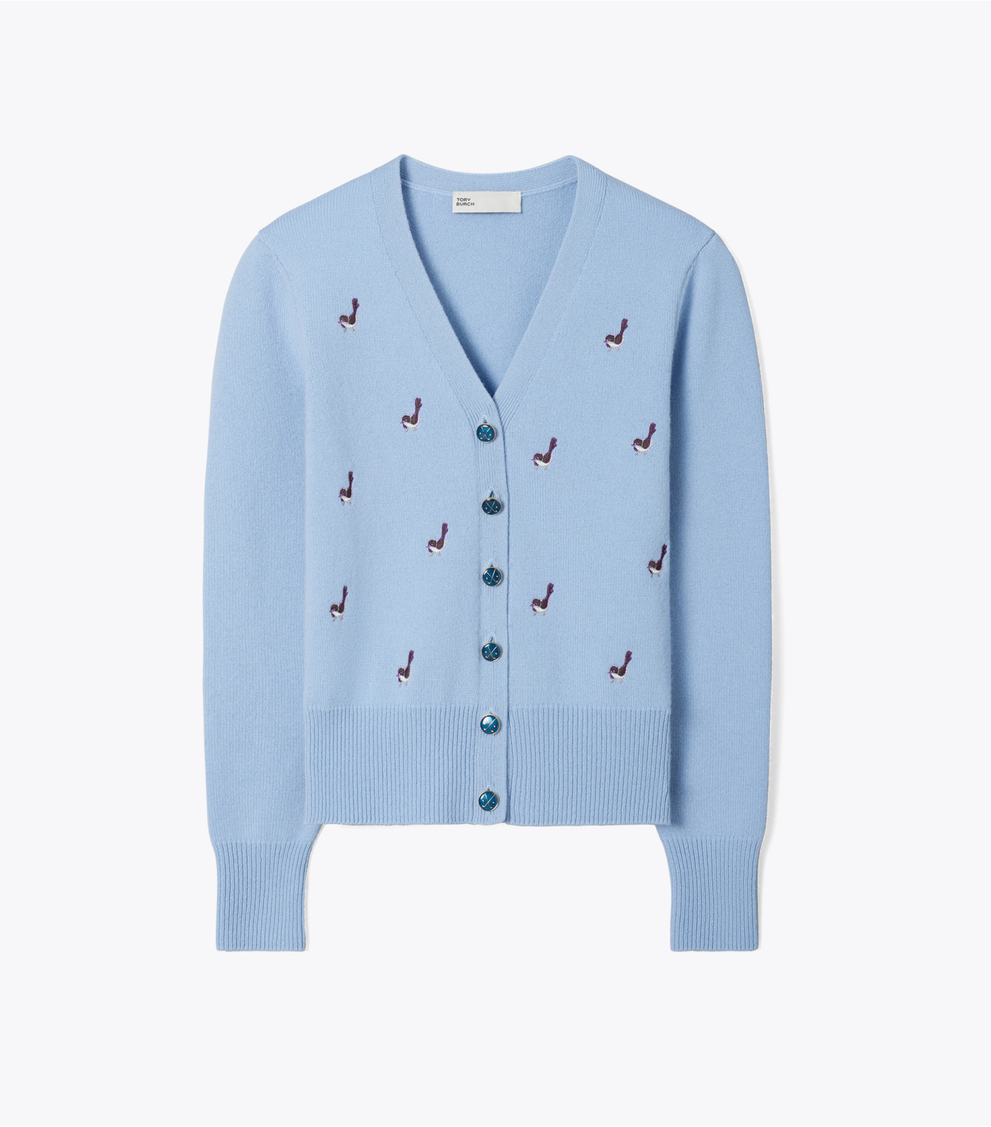 这款羊绒开衫绣有小鸟图案,灵感源自高尔夫球的计分方式,俏皮灵动,暗藏生趣。球场内外皆可穿着。