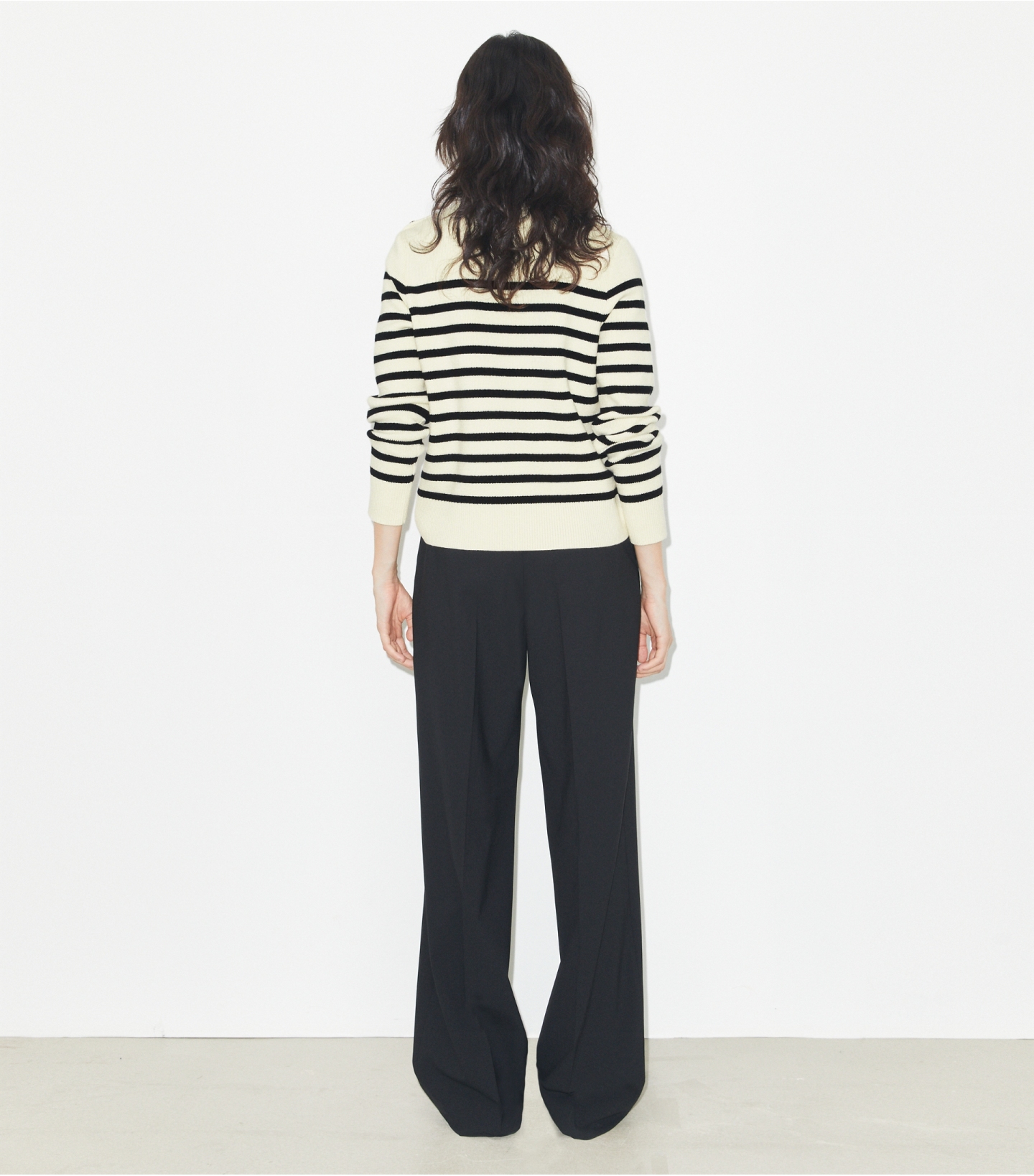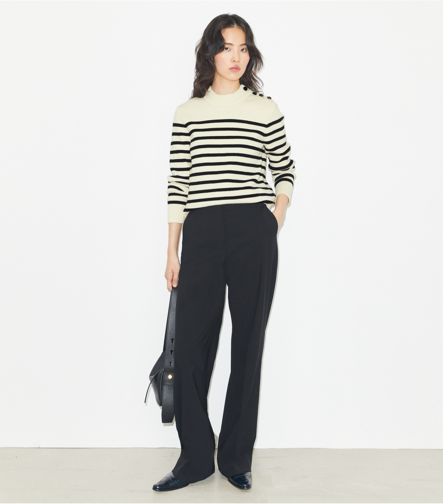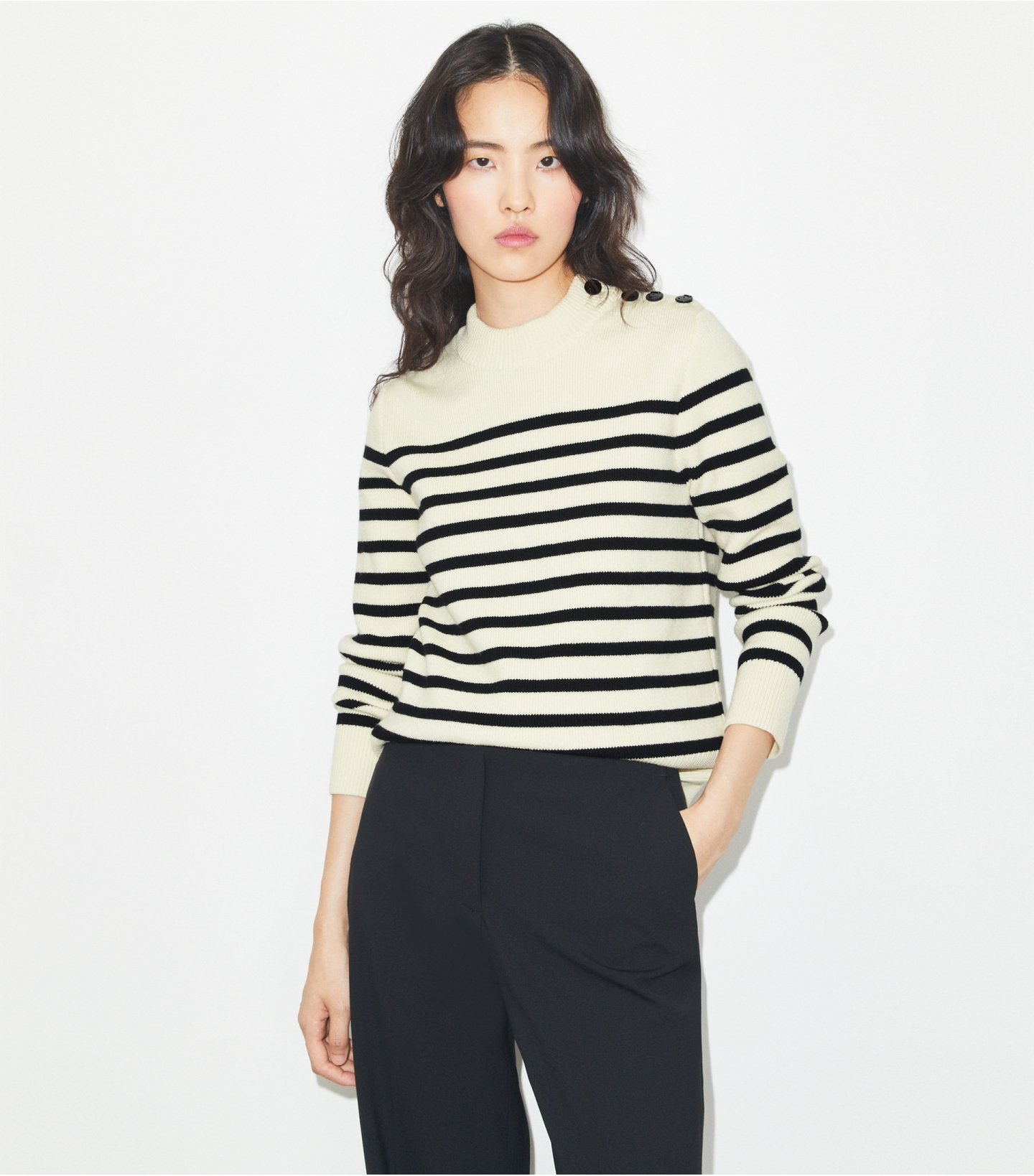 经典海军条纹,焕新演绎现代穿搭风格。这款羊毛毛衣左肩处饰有四颗纽扣,解开纽扣可敞开领口,营造松弛自在的休闲格调。