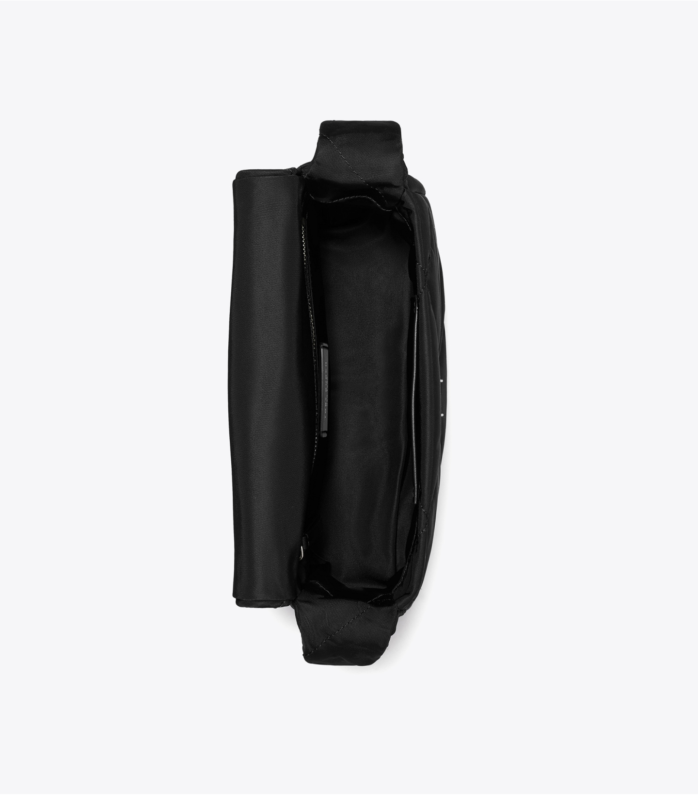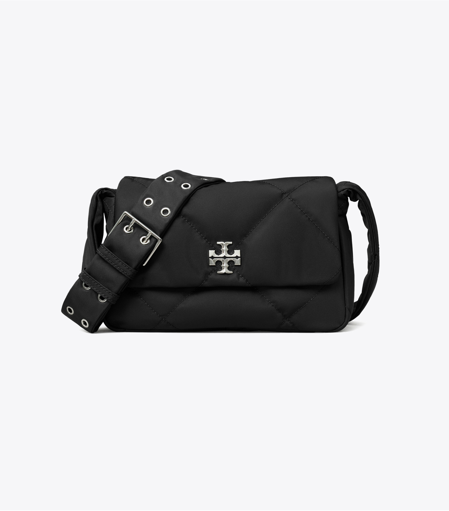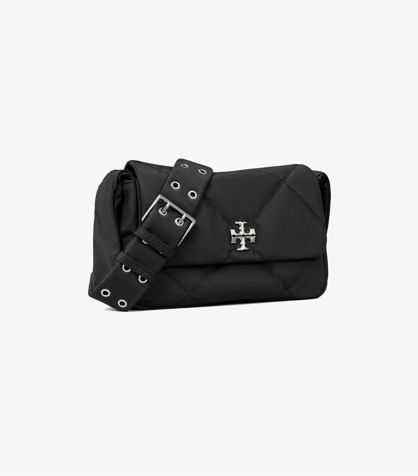 Kira 菱格纹绗缝肩背包,精选面料打造,呈现细腻光泽,配有斜纹双 T 饰件。实用包型设计,内设口袋,配有可调节肩带。