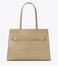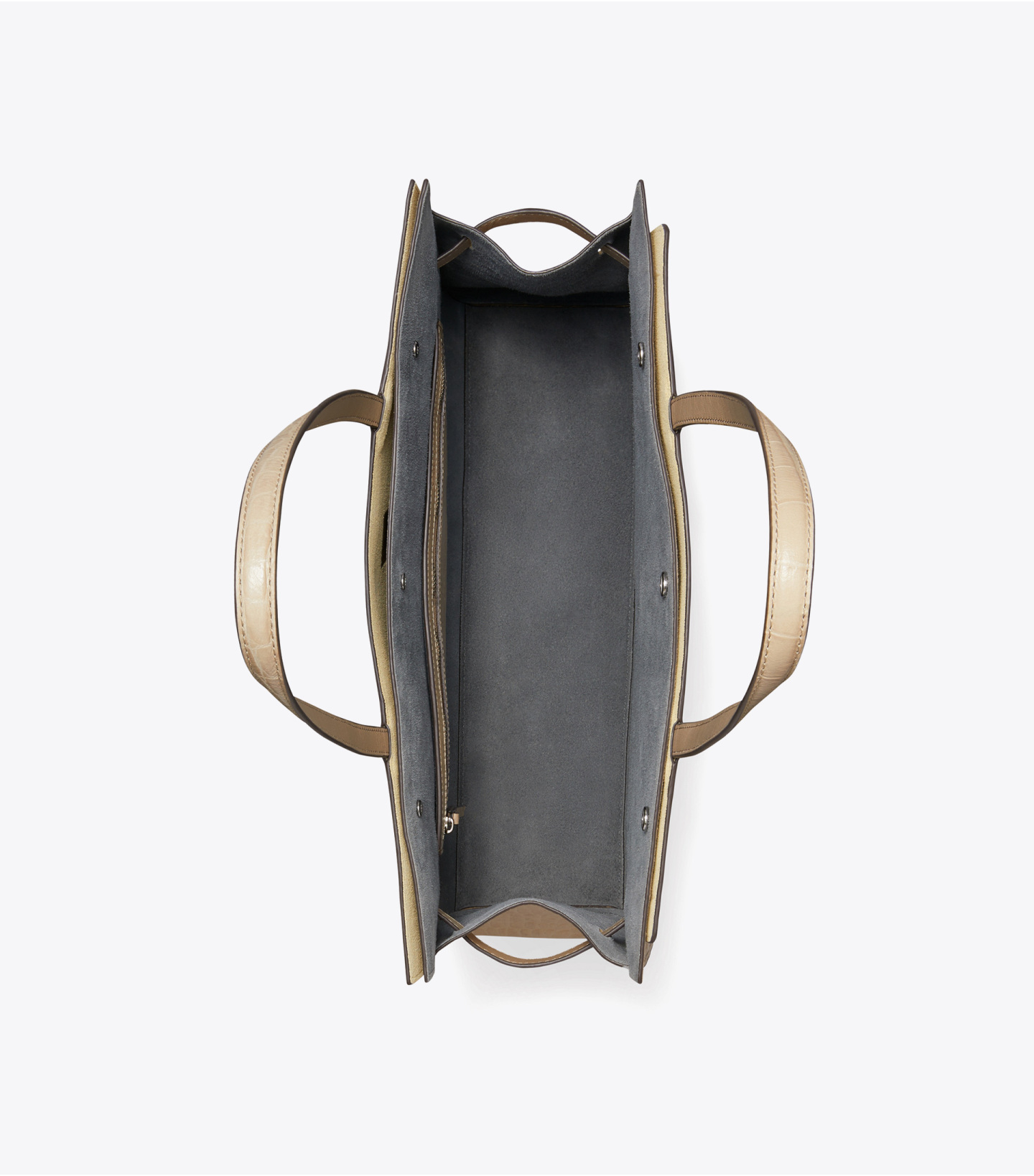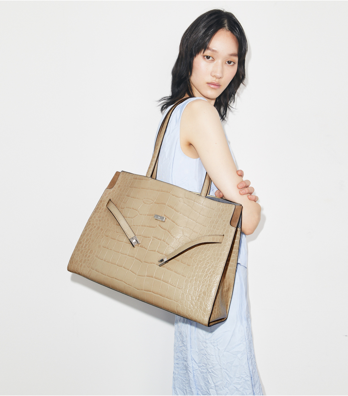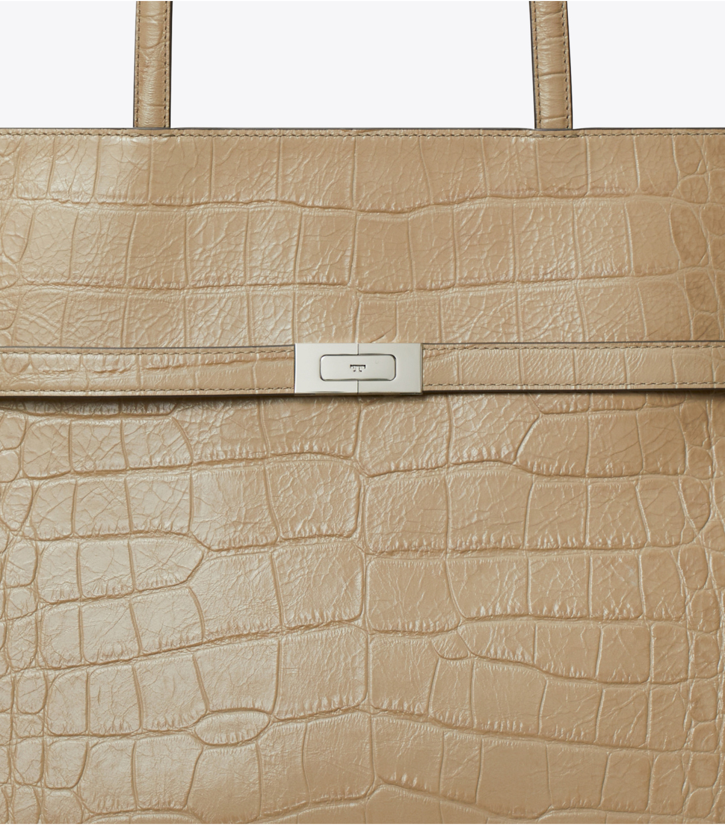 Lee Radziwill 托特包,精选鳄鱼纹皮革打造。内设三个隔层,便于收纳整理,并饰以标志性 T 型锁扣带。该系列以 Lee Radziwill 女士命名,她勇敢无畏,自成一派。