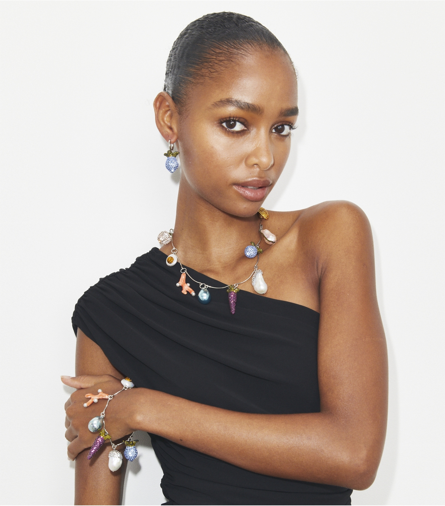 本系列宛如一个充满惊喜魅力与自在意趣的珠宝盒,赋予寻常物件全新意境。奇趣系列蔬菜造型耳环,采用先进电铸成型工艺打造,质感轻盈。不对称设计的茄子与萝卜吊坠,以手工镶嵌密镶。