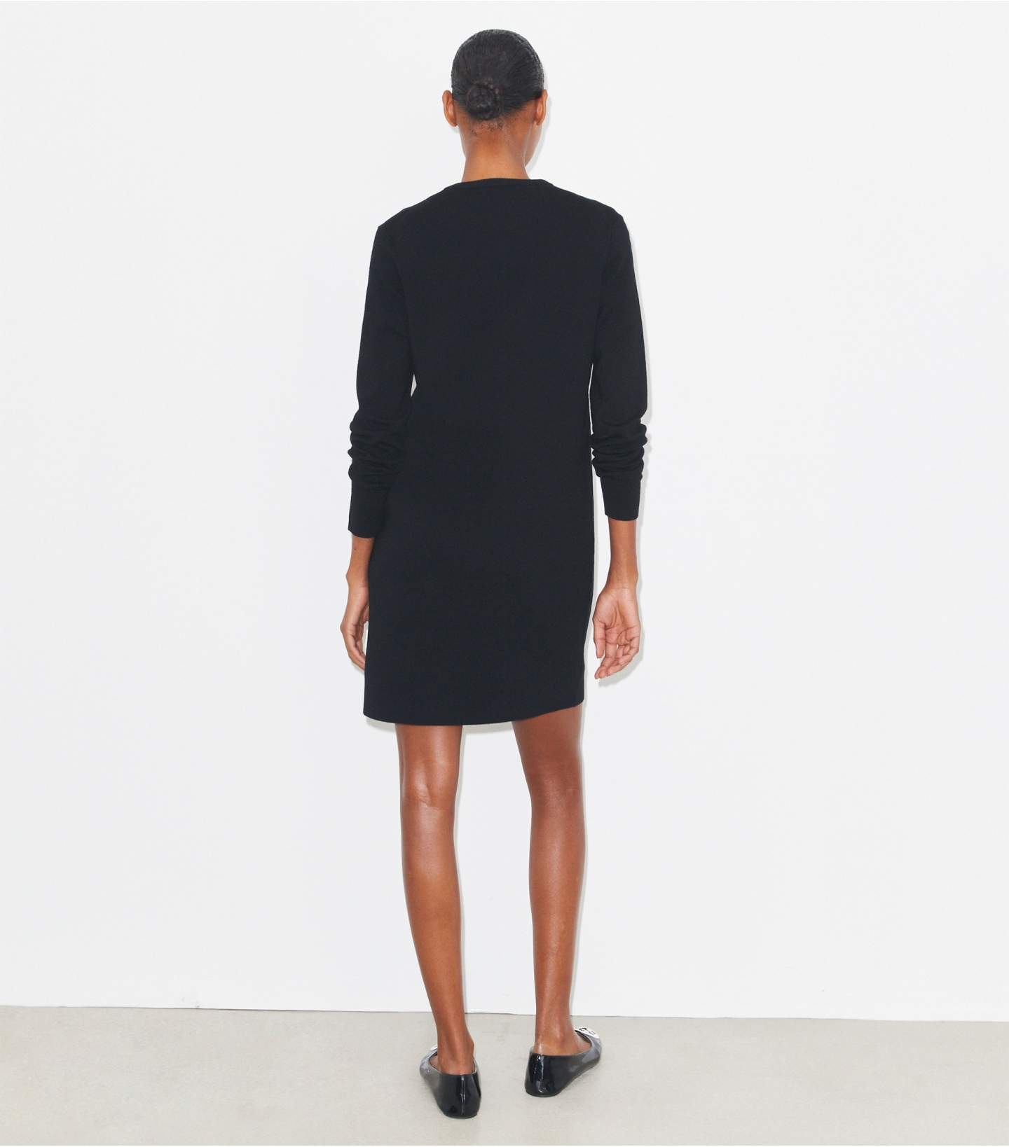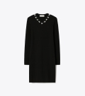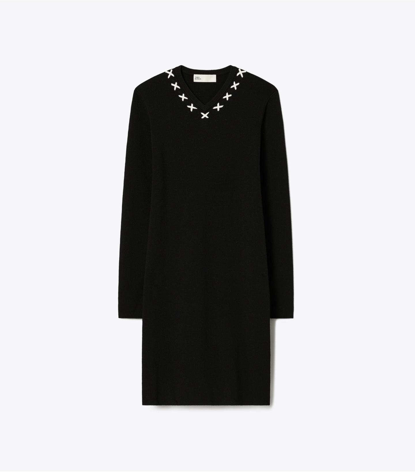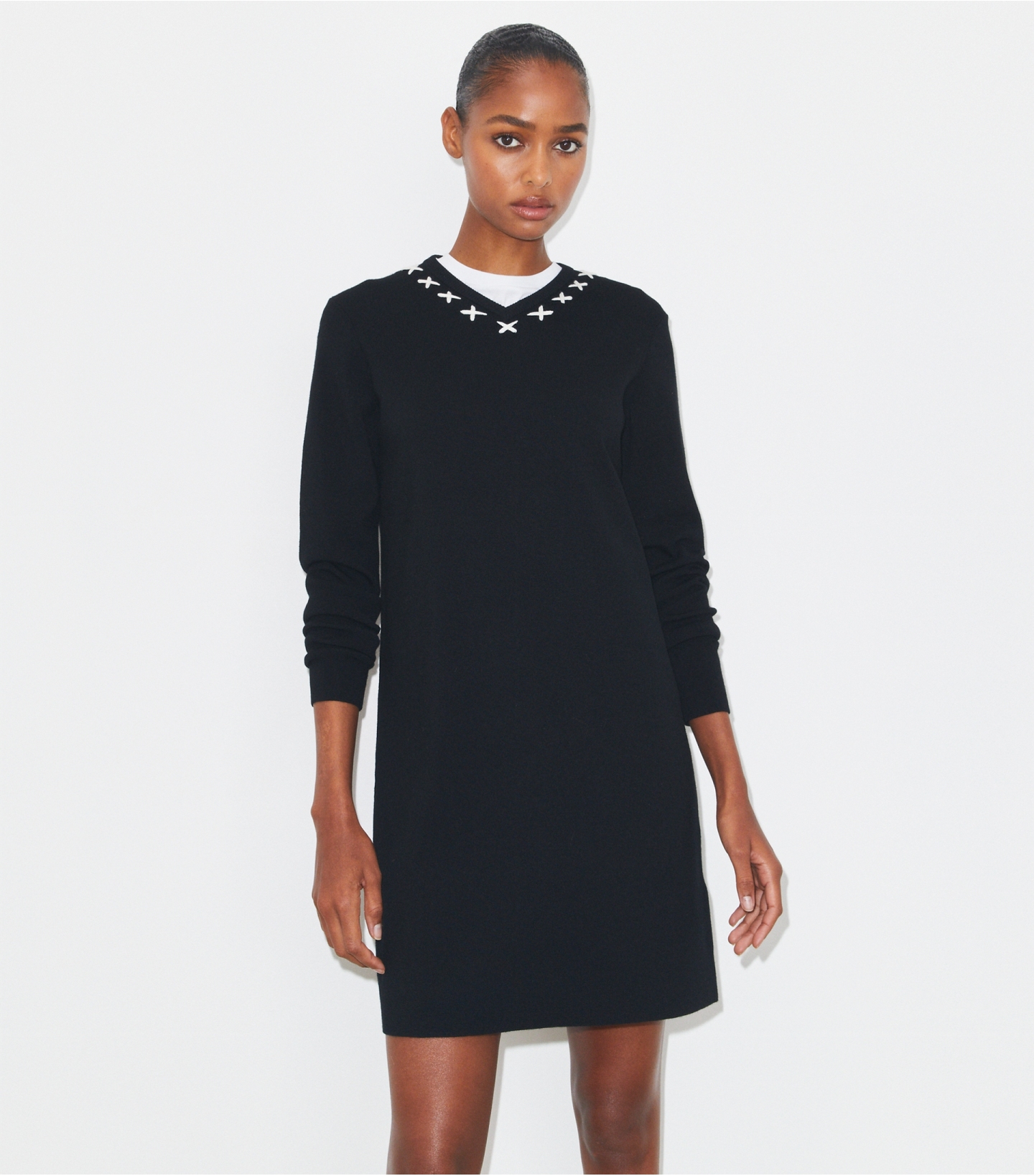 这款羊毛连衣裙,以图形元素焕新诠释经典小黑裙,简约廓形搭配长袖设计,V 领边缘饰有 X 形刺绣。精选羊毛混纺面料打造。