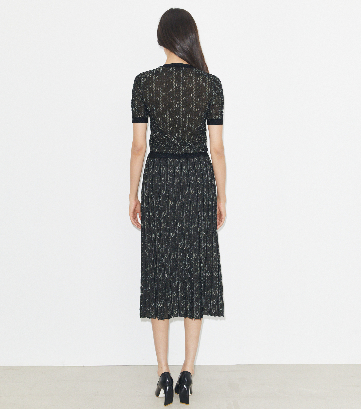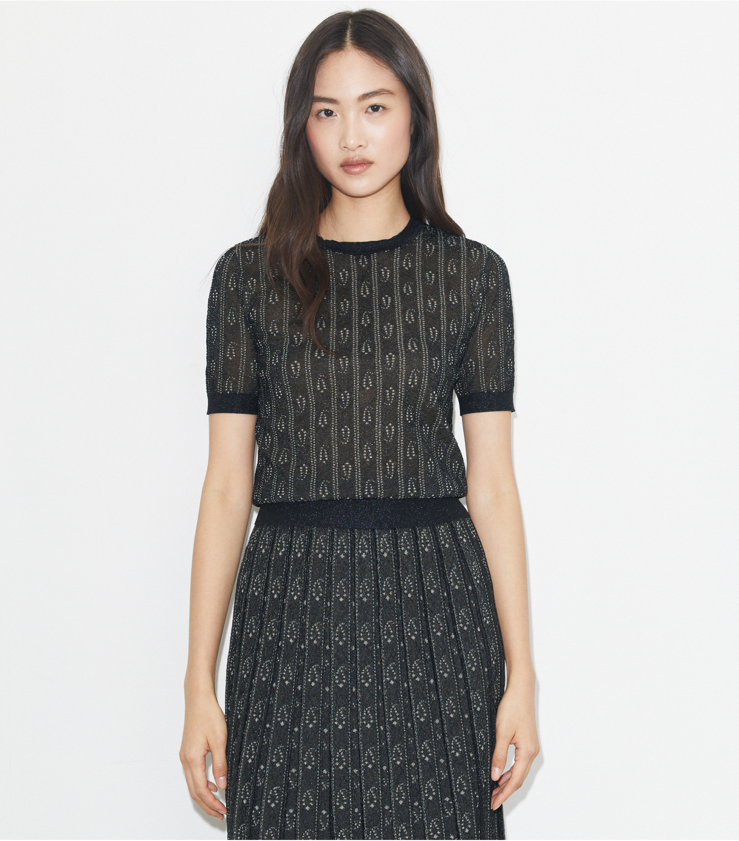这款提花圆领上衣,采用金属纤维精心织就,并融入抽象佩斯利花纹。精致针织面料打造百搭叠穿单品,在光影下格外华贵耀眼。