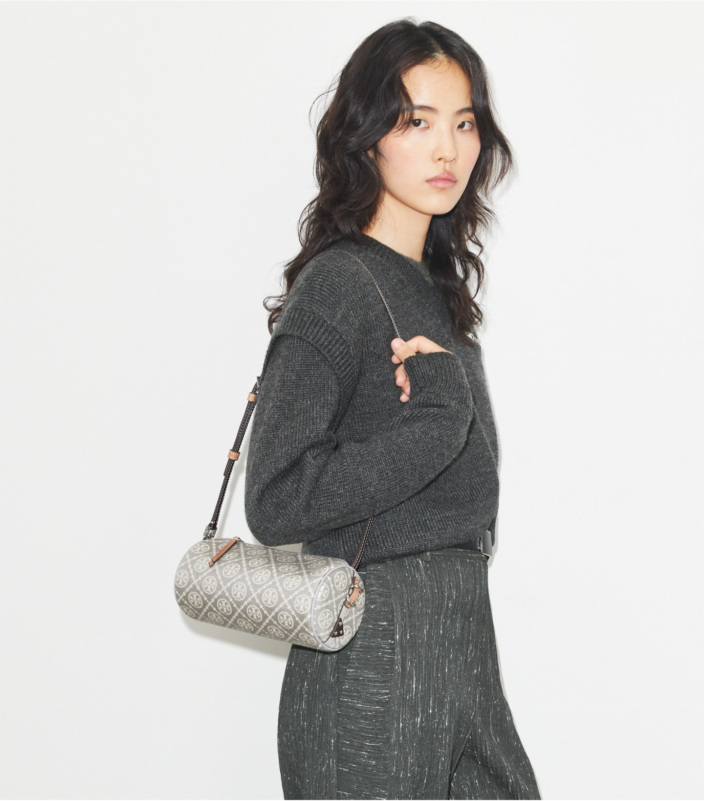 经典 T Monogram 图案,采用提花织物精心织就,融入实用主义设计细节。该系列魅力隽永,风格独具。T Monogram 圆筒包采用柔软棉质内衬,搭配安全拉链扣和针式按扣,可悬挂包饰。可作腋下包或肩背。每个细节均经过悉心考量,尤其注重功能性与多样性的结合。