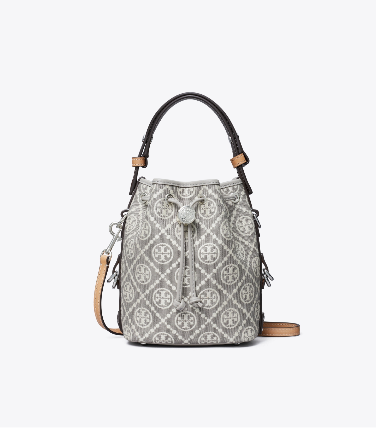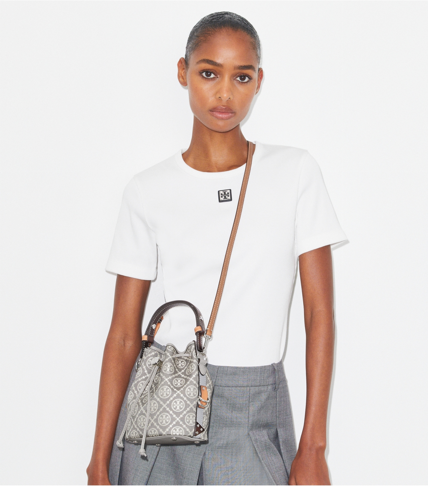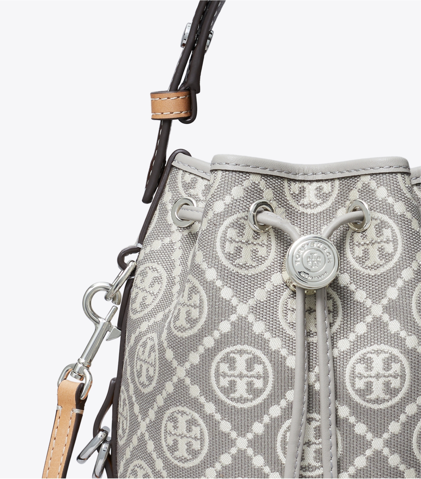 经典 T Monogram 图案,采用提花织物精心而制,融入实用主义设计细节。该系列魅力隽永,风格独具。这款迷你水桶包采用细腻皮革饰边,配有可调节顶部提柄,可挎在肩部,另有可拆卸斜背带,可随心变换背法。可通过金属双 T Logo 按扣调节抽绳长度。按压按扣可调节抽绳,松开即会锁上。每个细节均经过悉心考量,尤其注重功能性与多样性的结合。