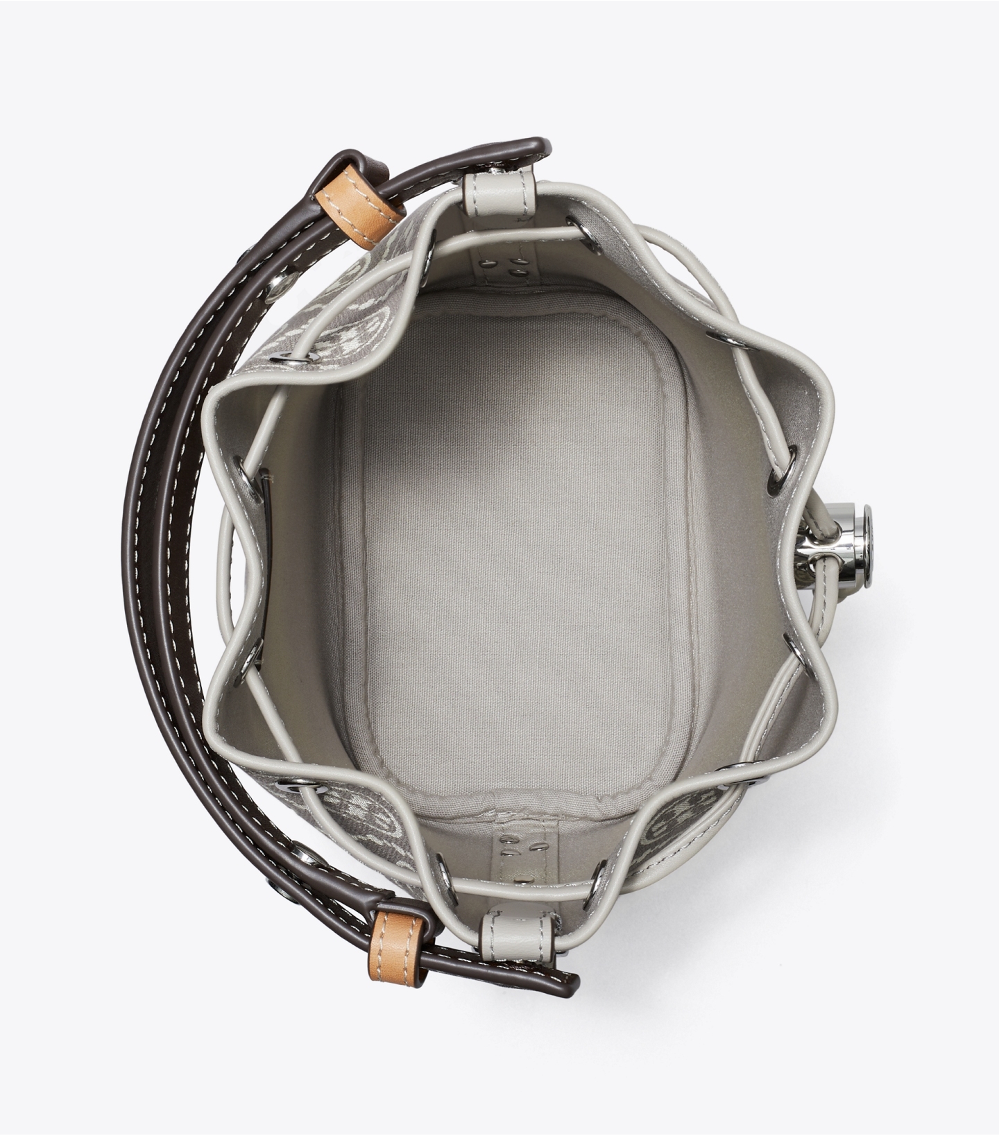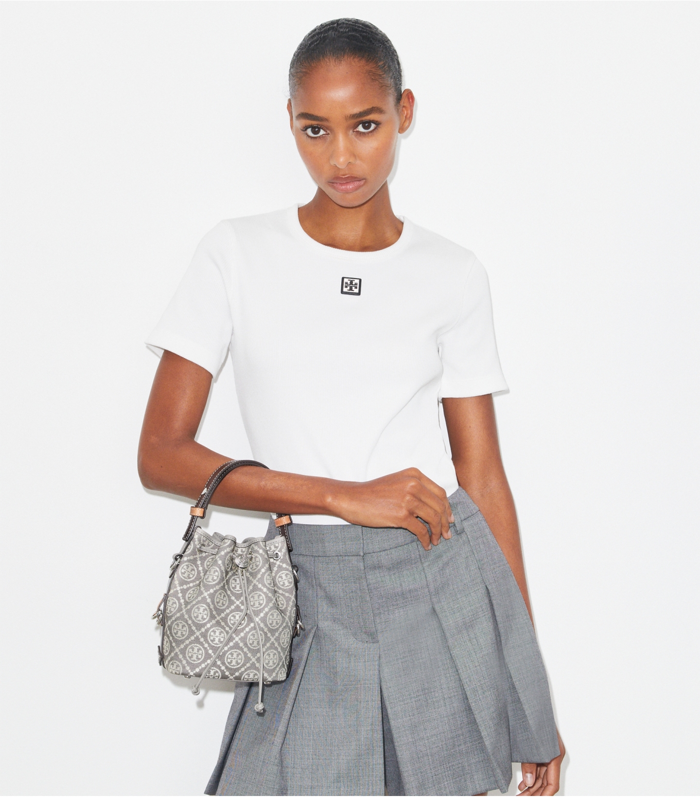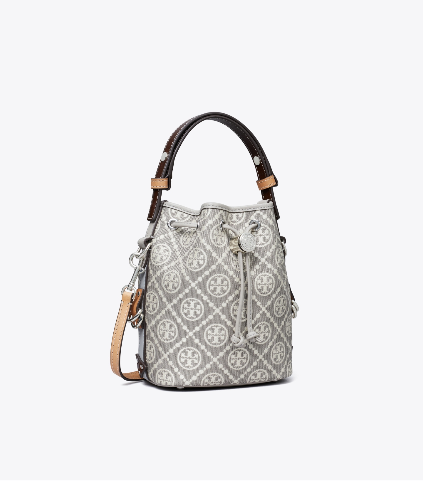 经典 T Monogram 图案,采用提花织物精心而制,融入实用主义设计细节。该系列魅力隽永,风格独具。这款迷你水桶包采用细腻皮革饰边,配有可调节顶部提柄,可挎在肩部,另有可拆卸斜背带,可随心变换背法。可通过金属双 T Logo 按扣调节抽绳长度。按压按扣可调节抽绳,松开即会锁上。每个细节均经过悉心考量,尤其注重功能性与多样性的结合。