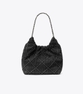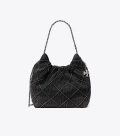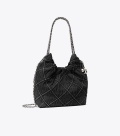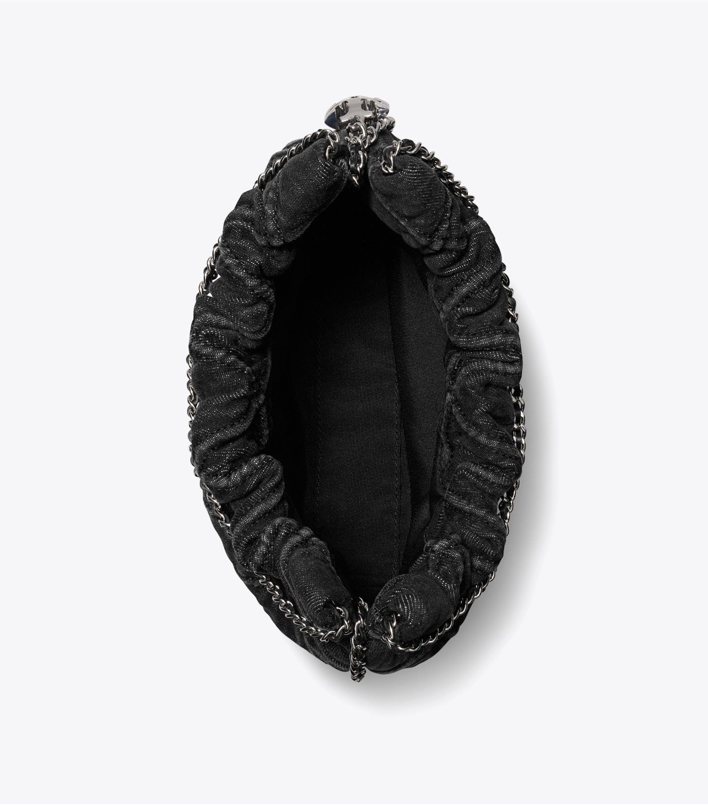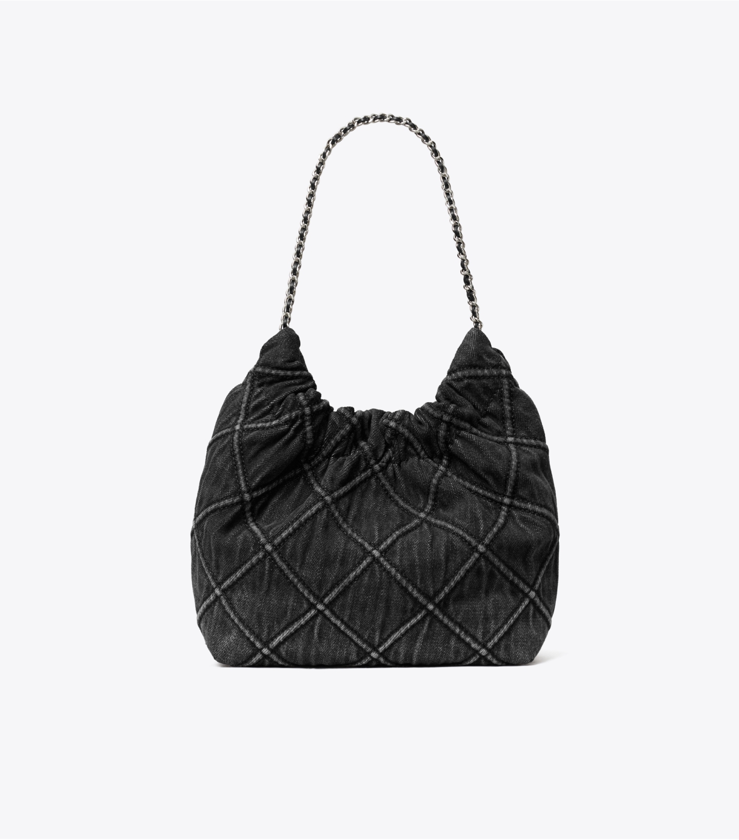 Fleming 迷你柔软肩背包,精选微渐变牛仔面料制成。包身缀以菱格纹褶饰,搭配皮革链条背带。