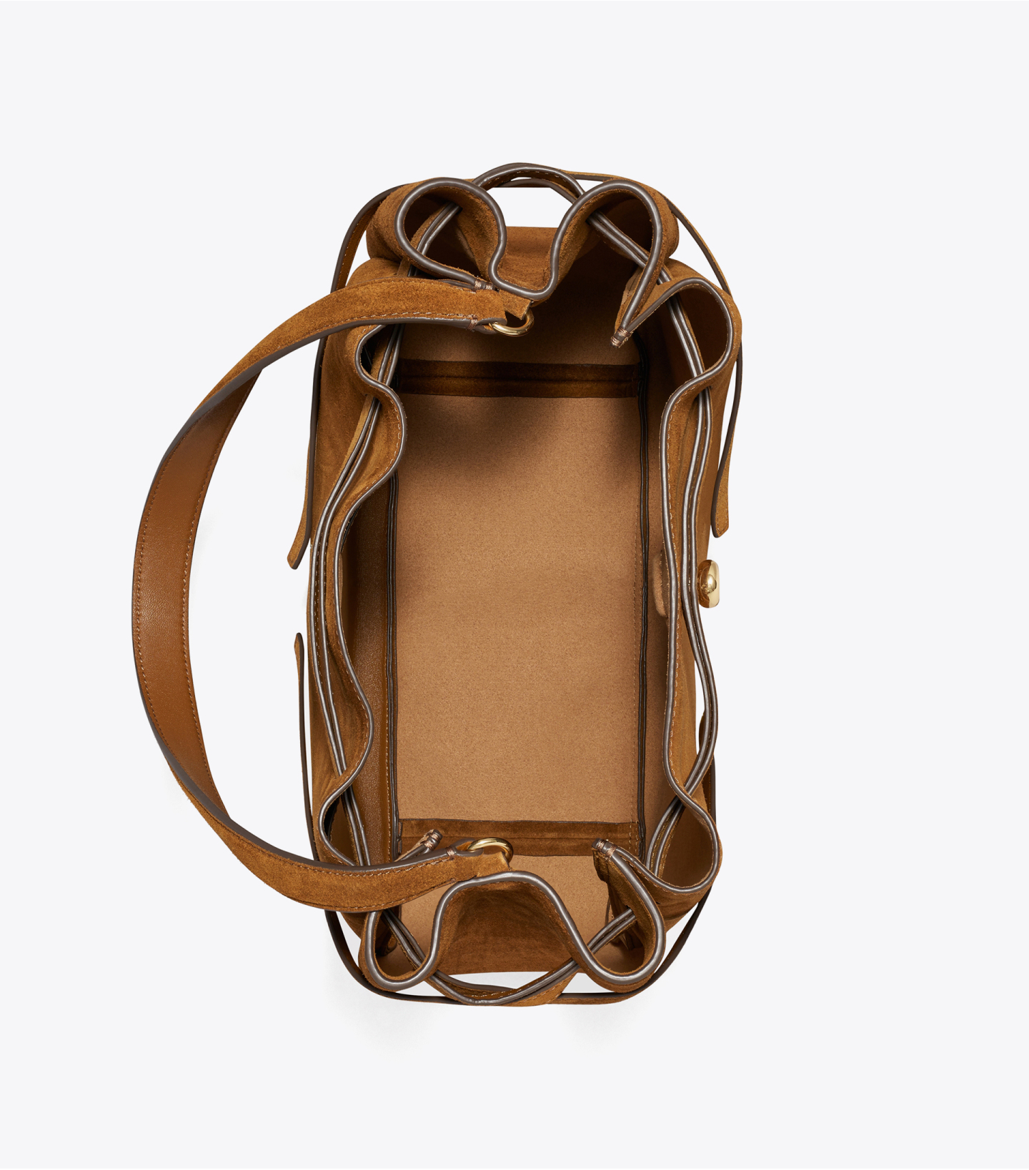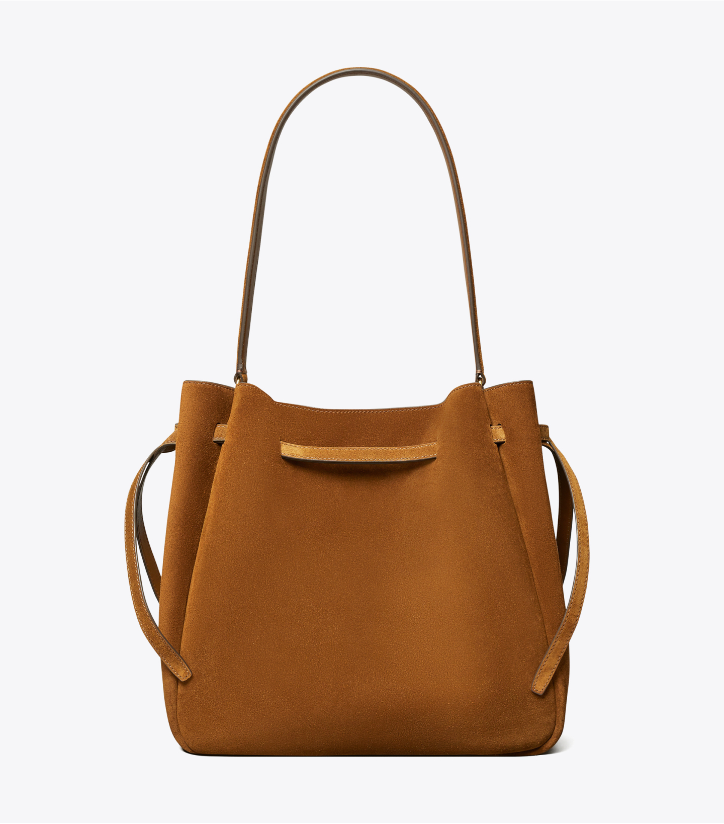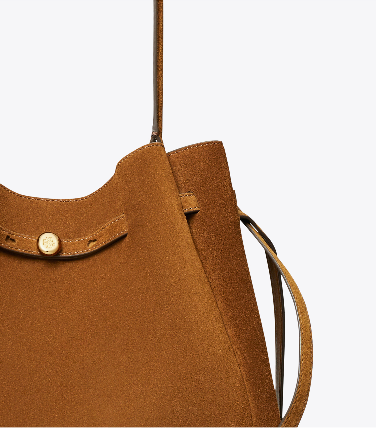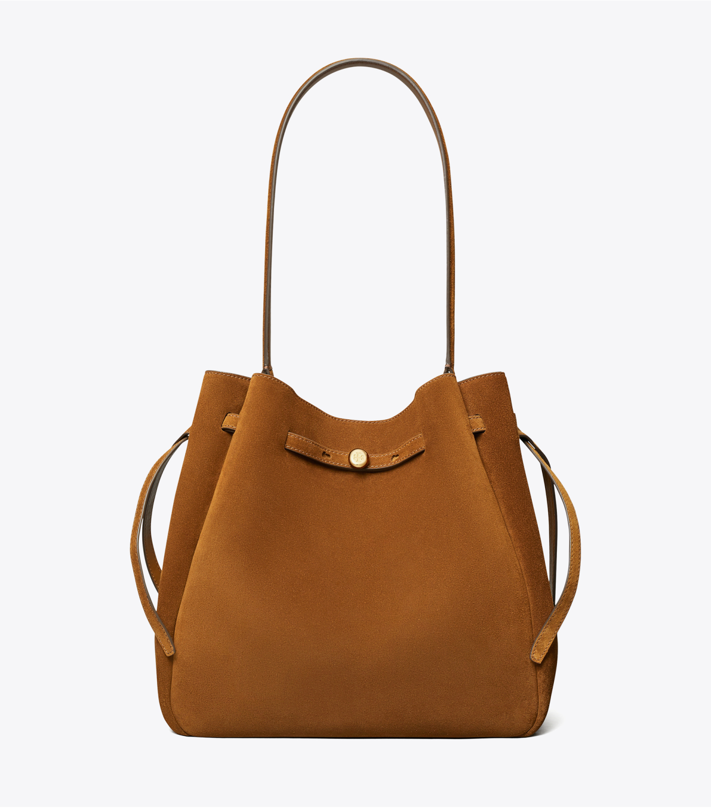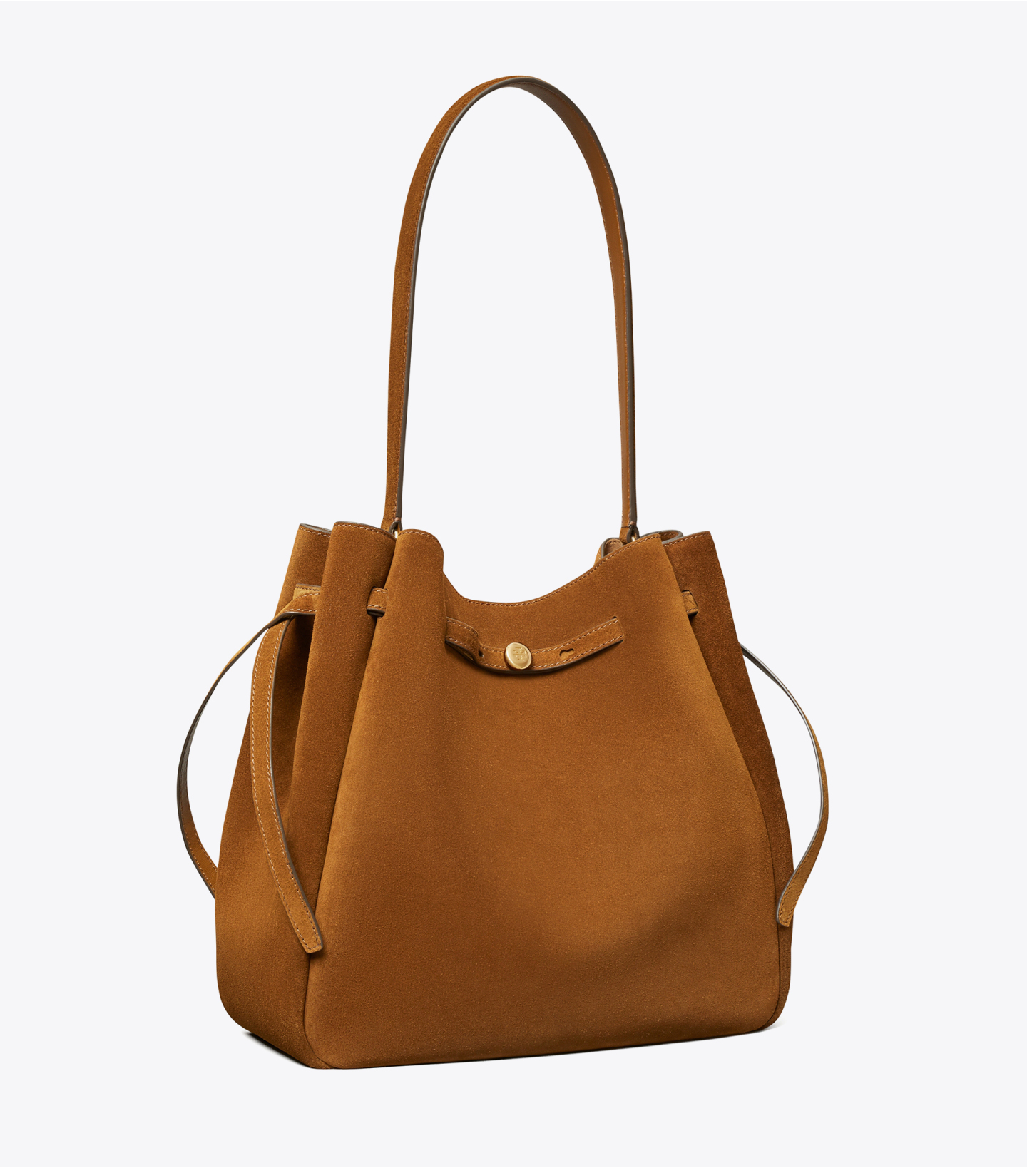 适合日常出行使用。Romy 大号水桶包精选柔软绒面革打造,廓形灵巧,顶部巧妙收拢,富有质感。包身轻盈,内部空间宽敞,配有一个口袋,可轻松收纳手机、钱包、笔记本电脑及水壶。配有纤细背带并融入全新纽扣式 Logo,为造型增添时尚亮点。可手提或斜挎,满足多样穿搭需求。