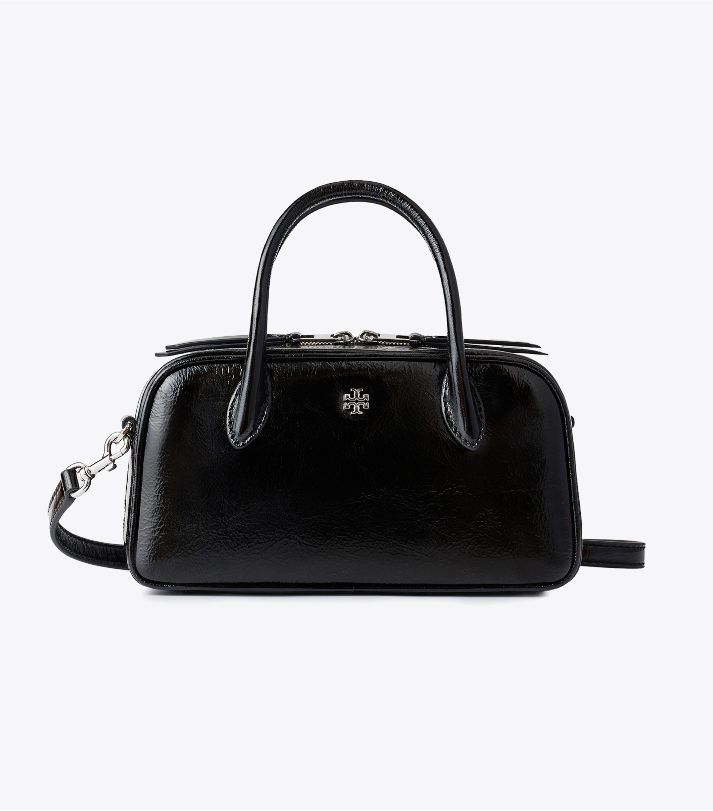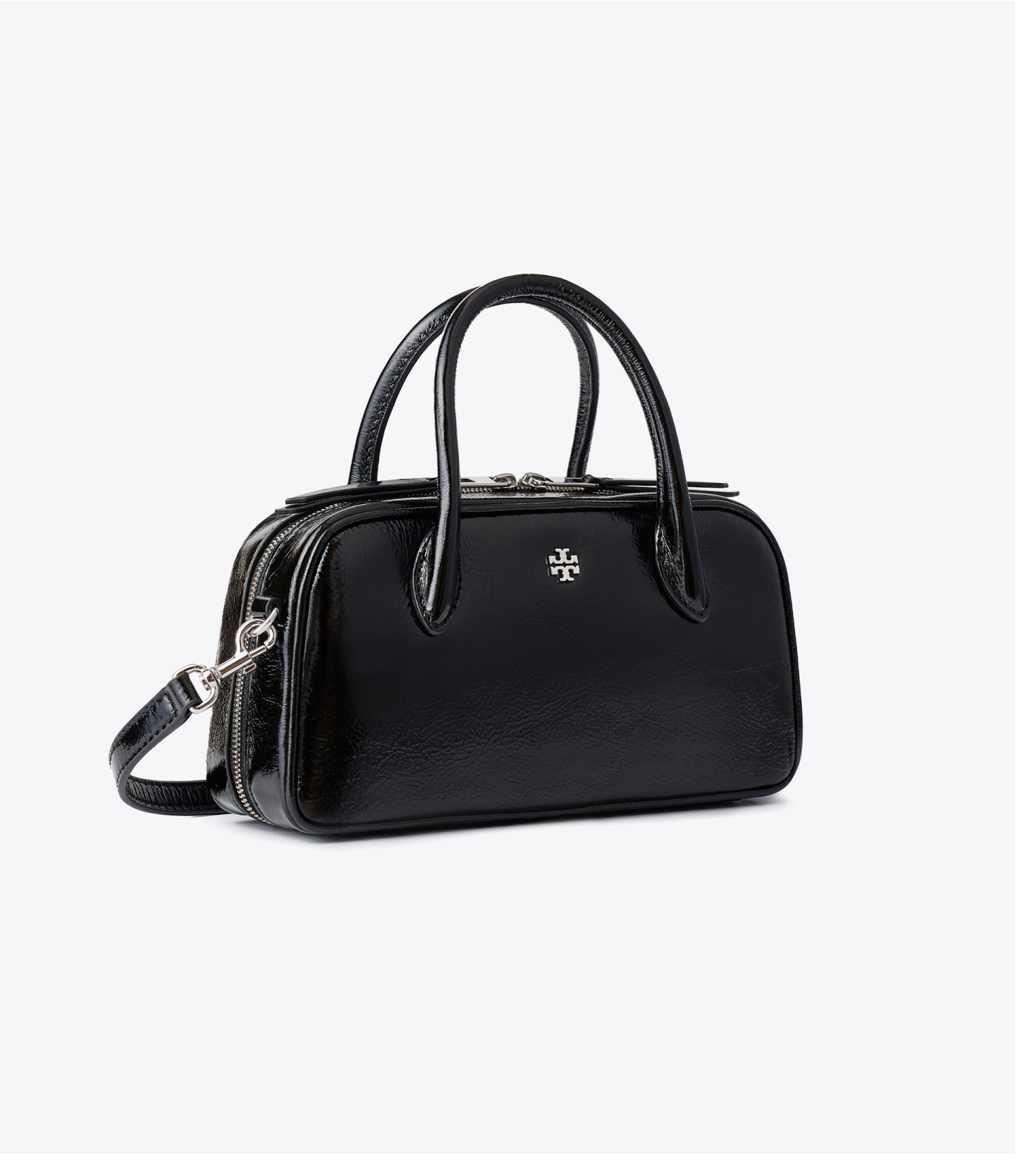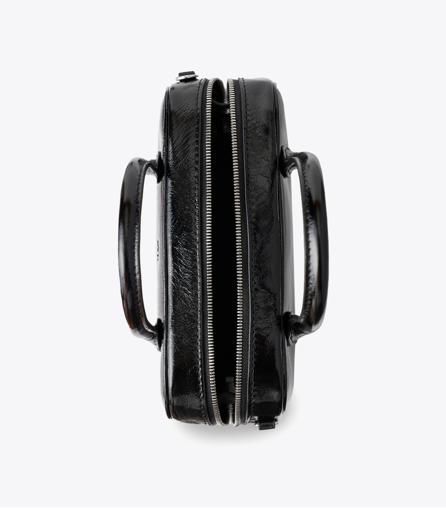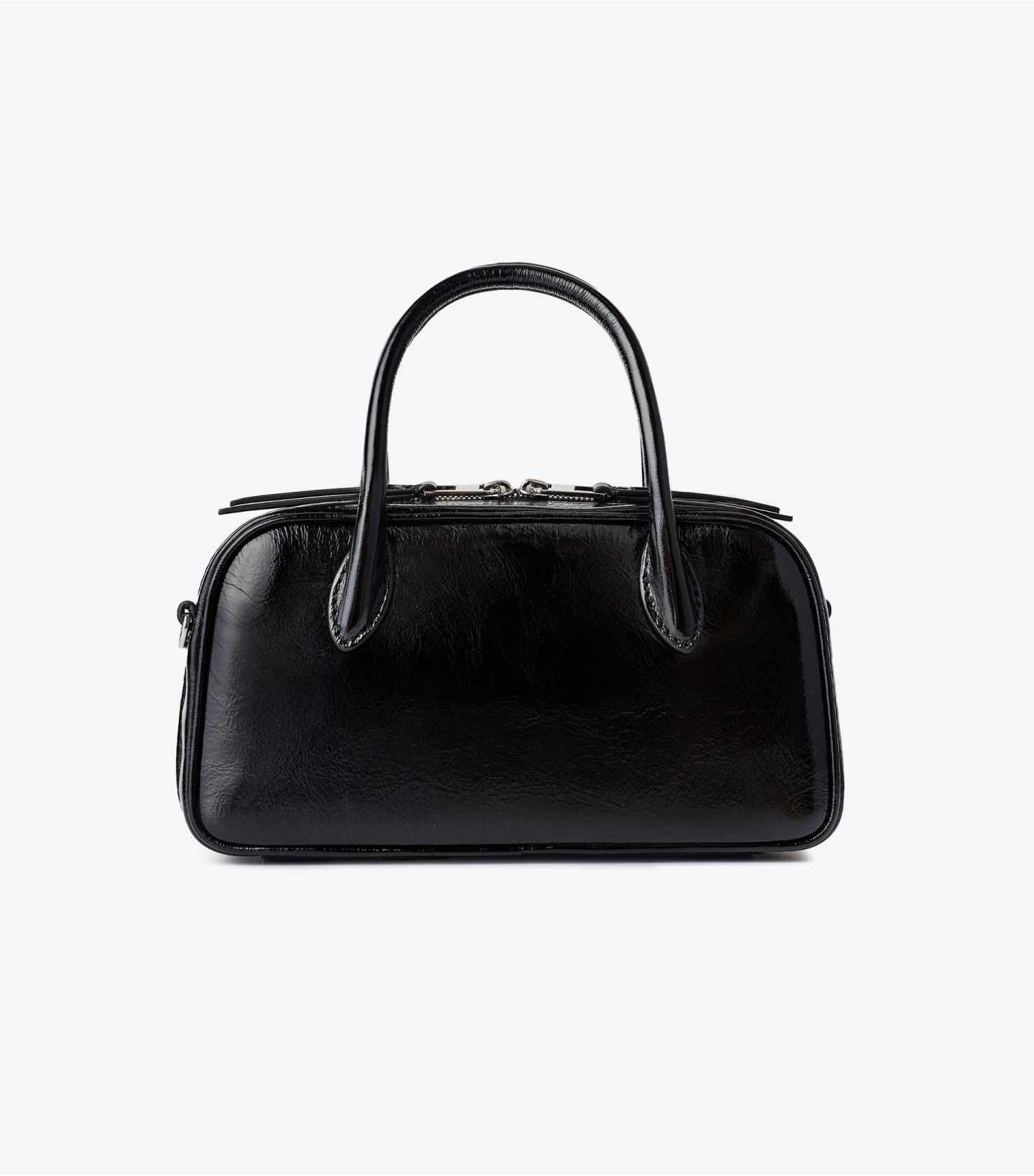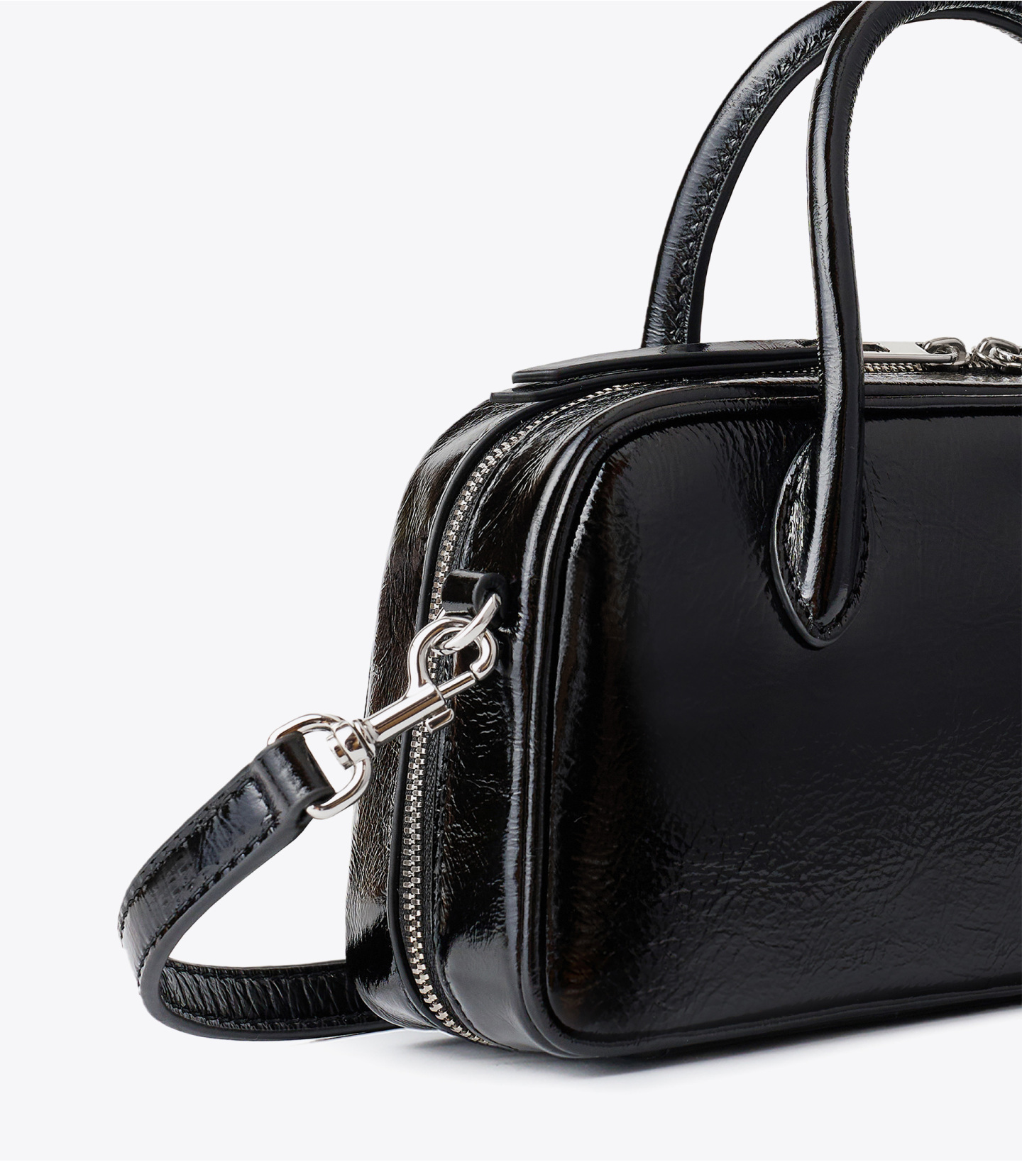 这款迷你盒型斜挎包,呈现出抛光般的亮泽质感。内设口袋,便于收纳,可容纳手机、小钱包与钥匙。可使用顶部提柄手提,或可拆卸斜背带斜挎。