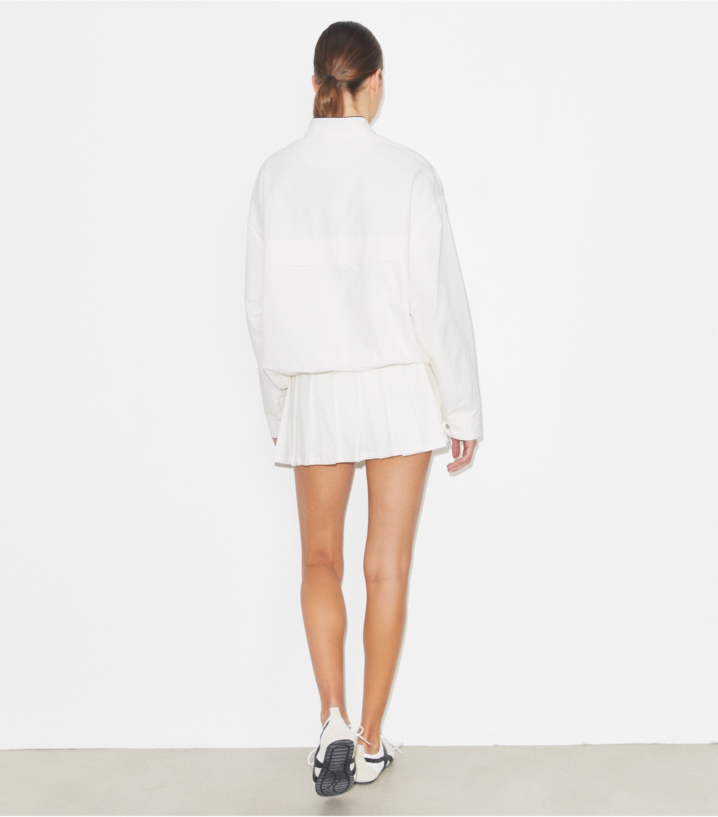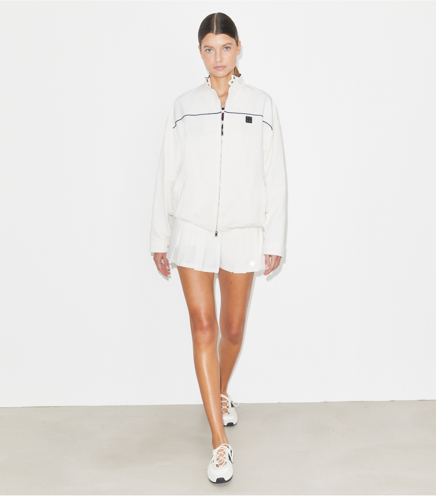 这款复古风格的网球夹克,采用舒适宽松的大号版型设计,配有全拉链前襟,搭配内缝拉链口袋和网眼布内衬。细节处饰以撞色滚边与前襟 Logo 贴片。是球场内外应对换季天气时的理想穿搭之选。