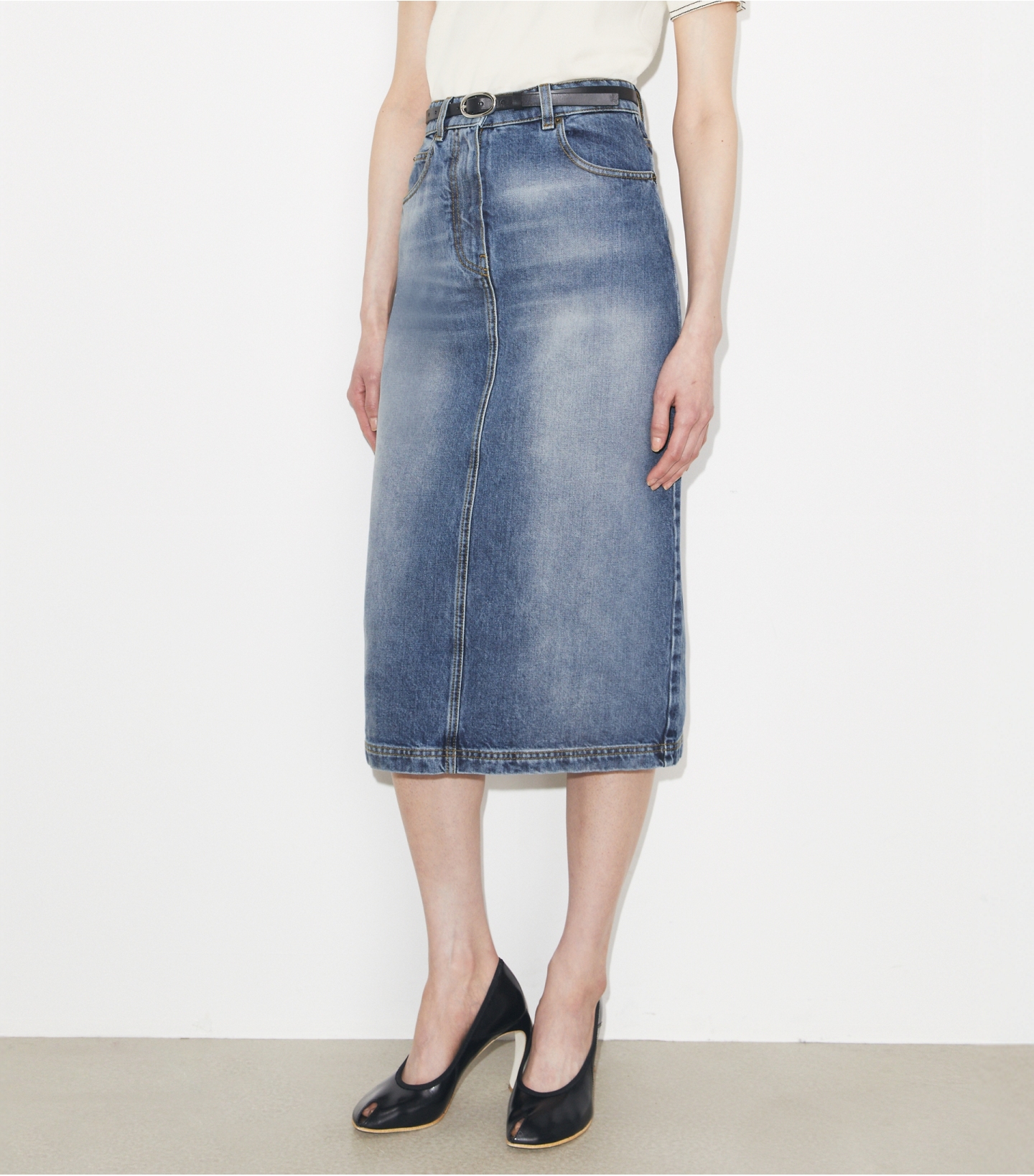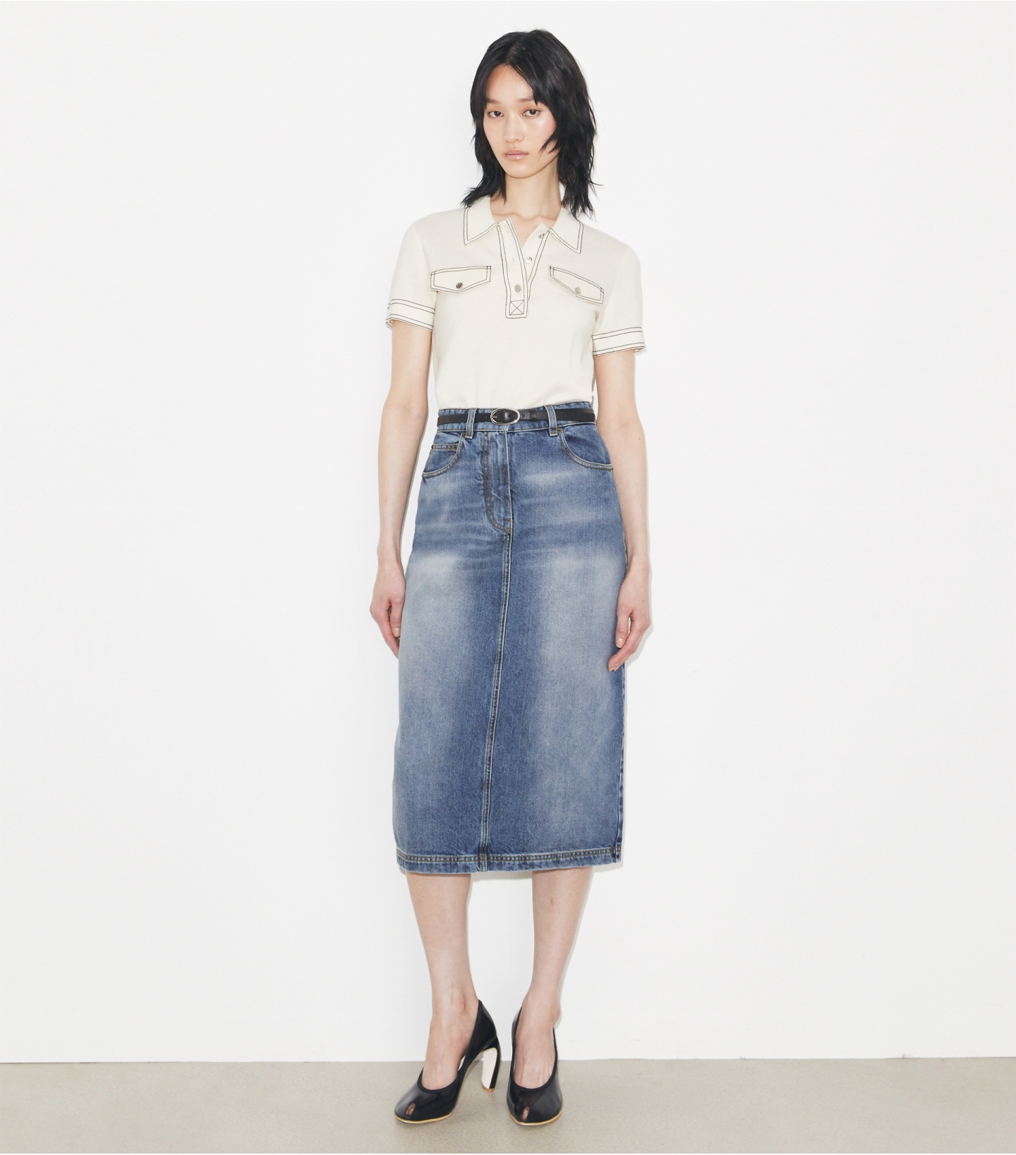 这款经典牛仔半身裙,采用牛仔布面料焕新打造,后摆采用不对称开衩设计,后袋饰有刺绣 Logo。