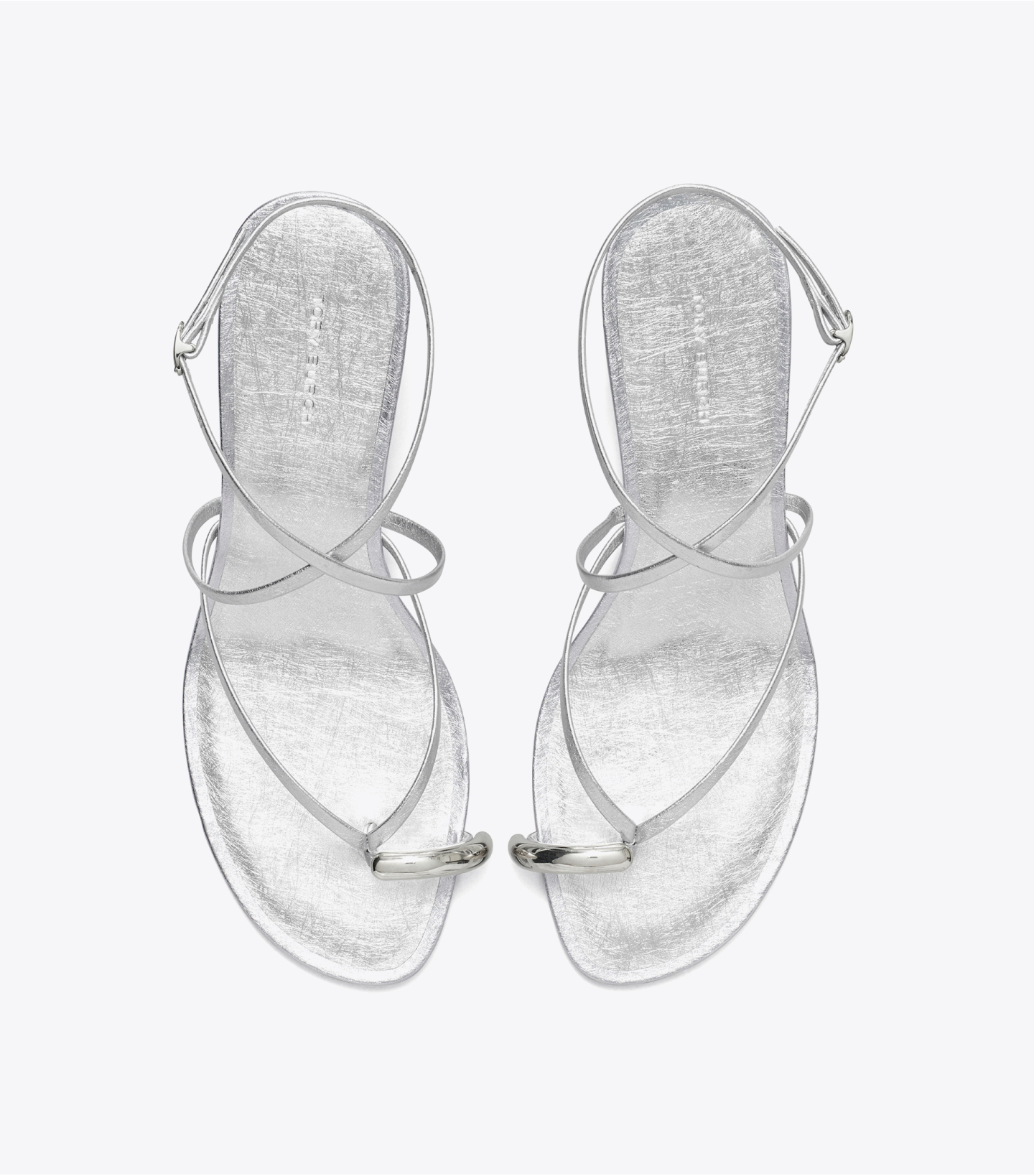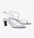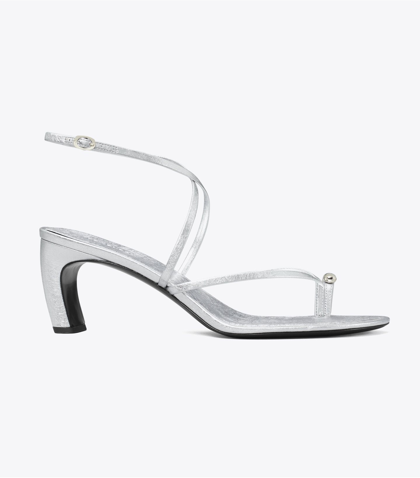 超现实 Pierced 光环系列,焕新推出低跟凉鞋。鞋面采用纤细皮革系带设计,以夹趾带为起点,交叉缠绕至脚踝。金属饰件营造出佩戴趾环的错视效果,弧形鞋跟与现代造型相得益彰。采用褶皱金属质感皮革精心而制。