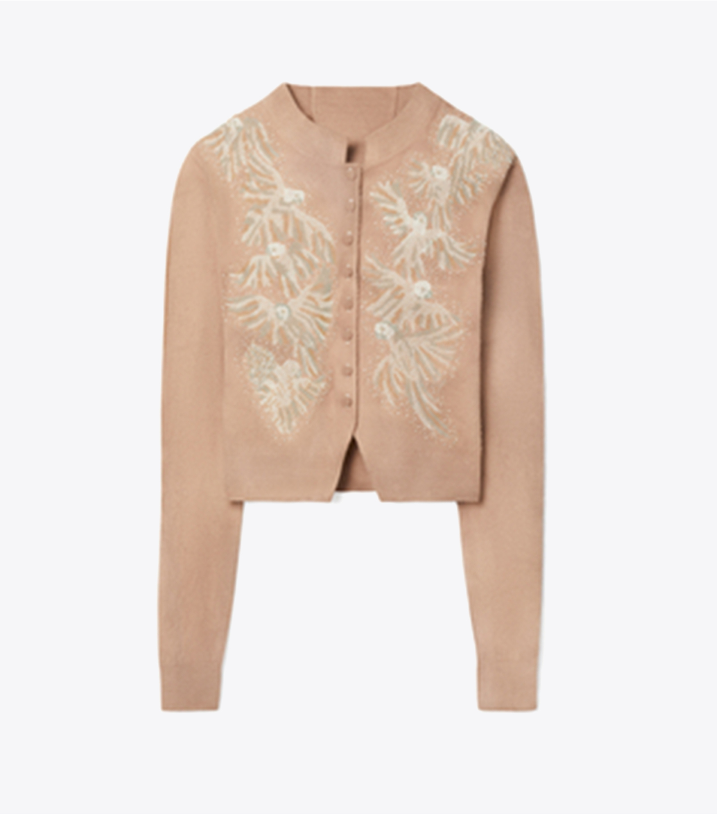 2026 年春季系列以全新视角演绎运动风,融入浪漫、感性与匠艺。这款亮相于秀场的羊毛开衫,以羊毛与羊绒编织而成,并点缀手工珠饰。飞鸟纹样 图案灵感源自 Tory 家族世代相传的一把座椅。经过套染与缩绒处理,触感更加柔软舒适,并采用短款修身版型。
