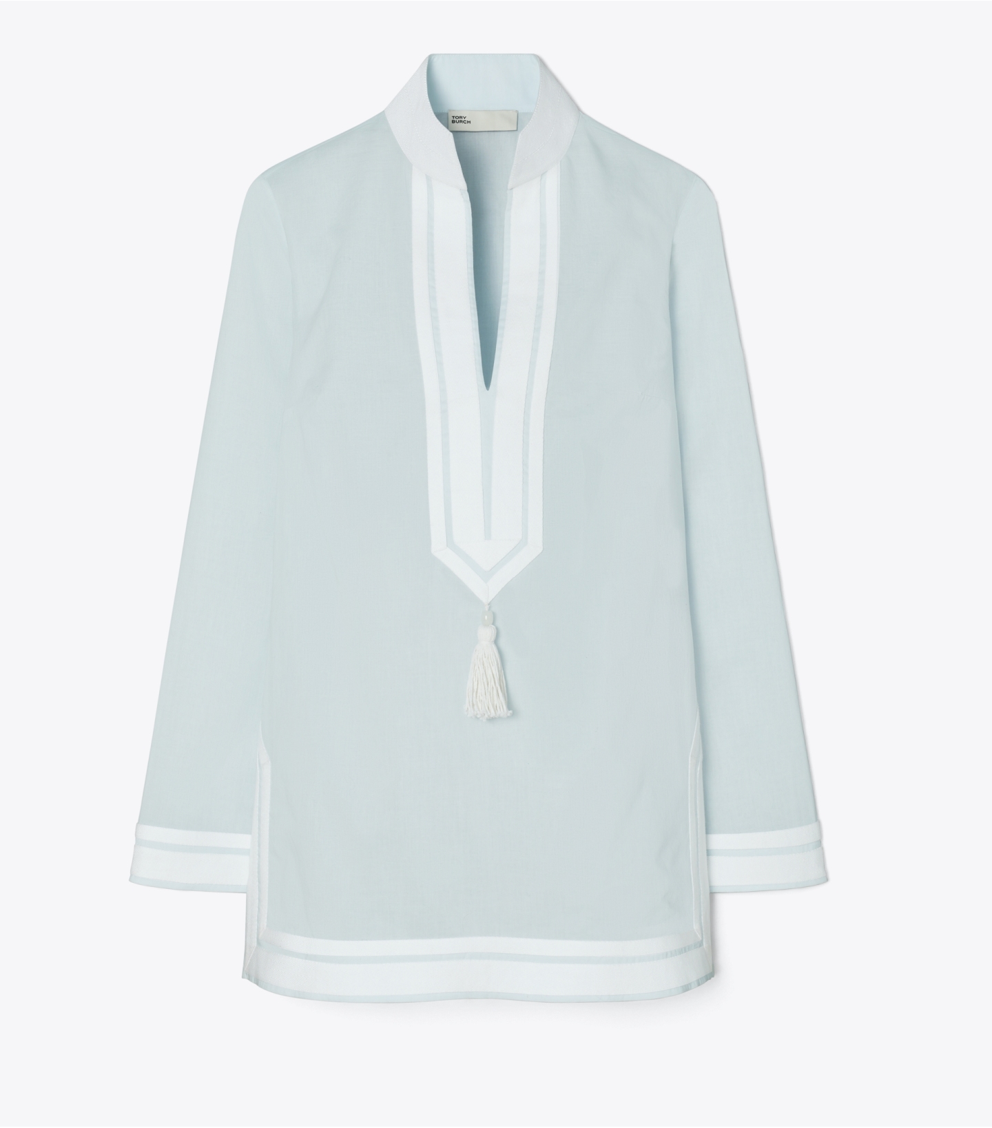 Tory Burch 的经典款型。灵感源自品牌创始人Tory的旅途见闻,也是品牌最早设计的基础廓形之一。这款流苏长款衬衫,精选轻盈棉质薄纱而制,在衣领、袖口和下摆处以人字斜纹饰边点缀。采用休闲剪裁,适合所有身材穿着,彰显低调魅力。