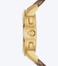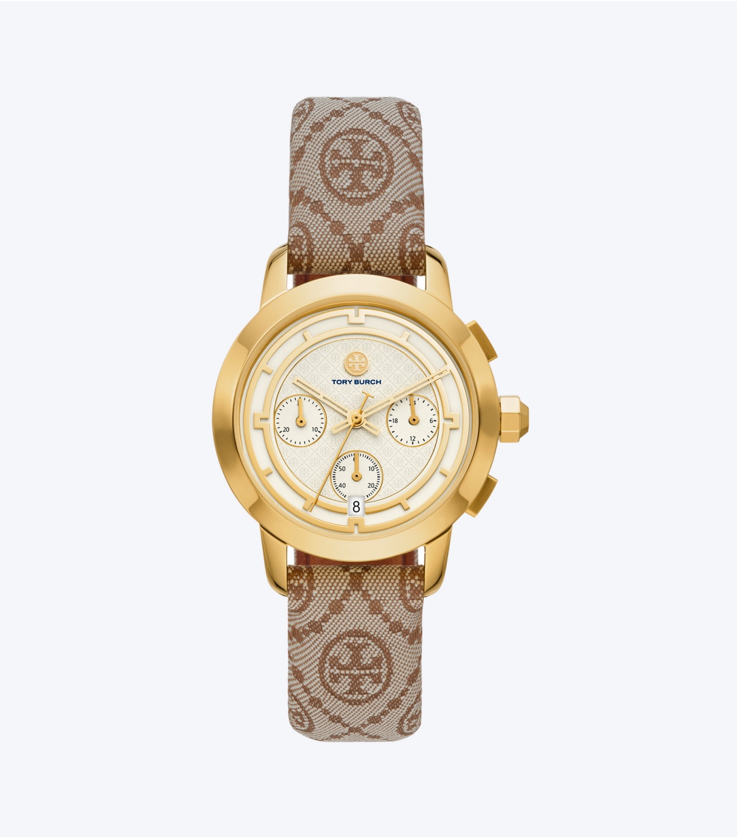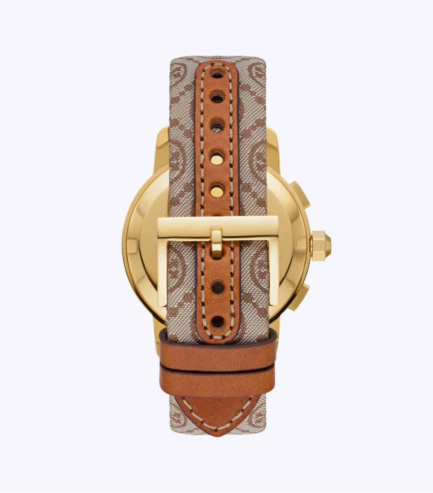 这款计时腕表采用经典的运动风格,搭配金色表壳和八边形表冠,传递精致时尚感。每一个设计细节,凸显实用功能性。