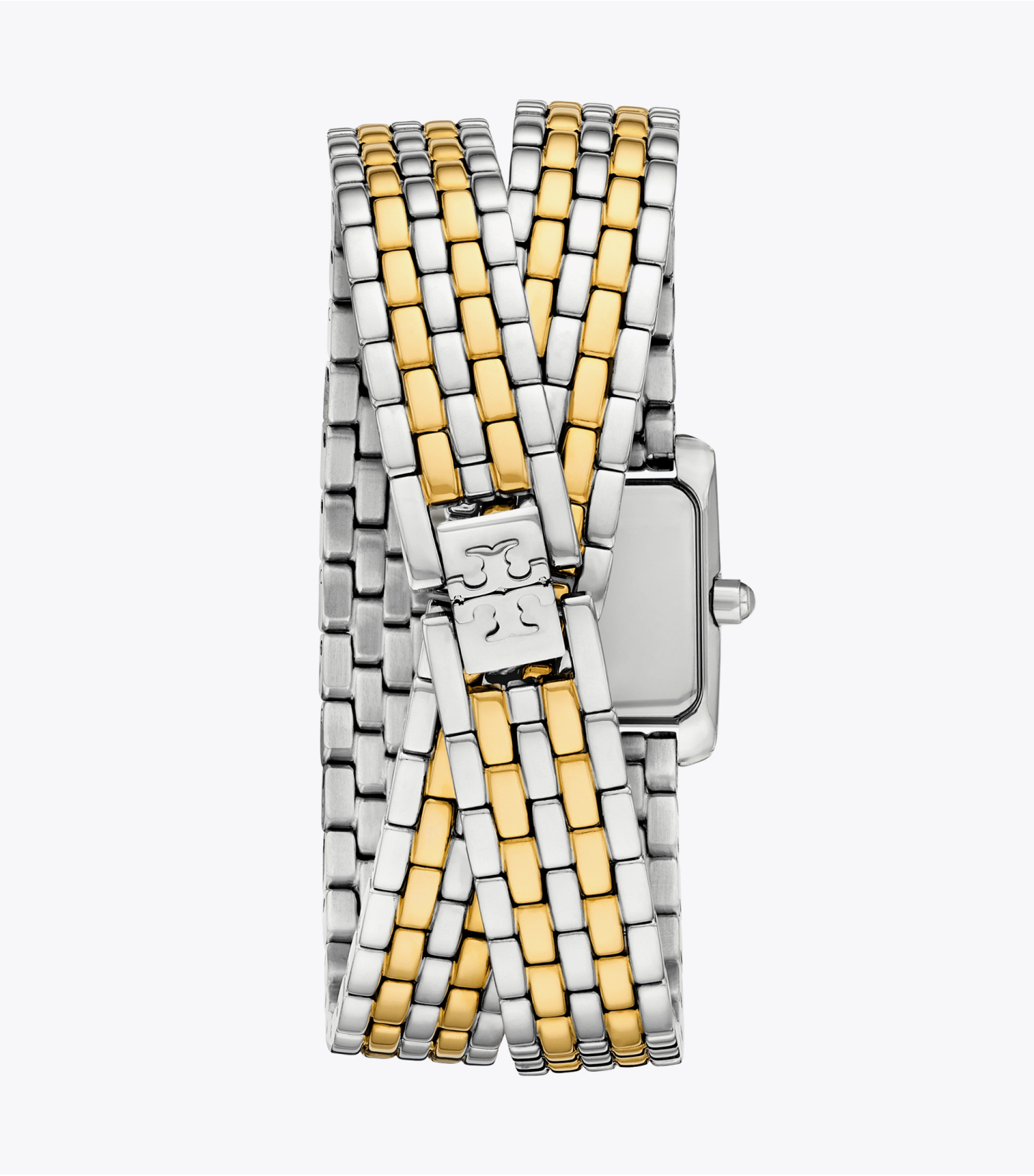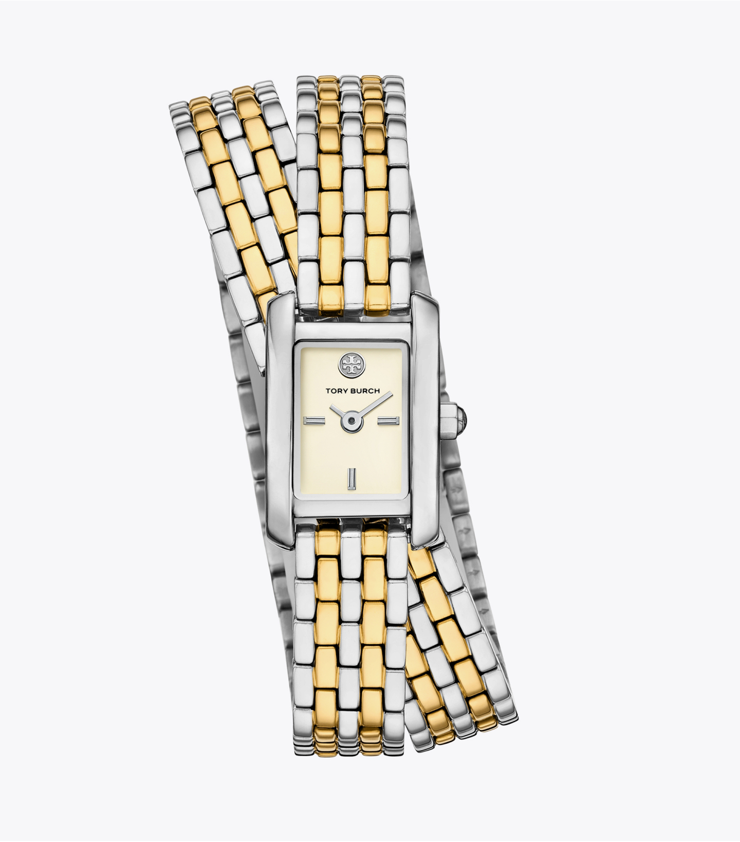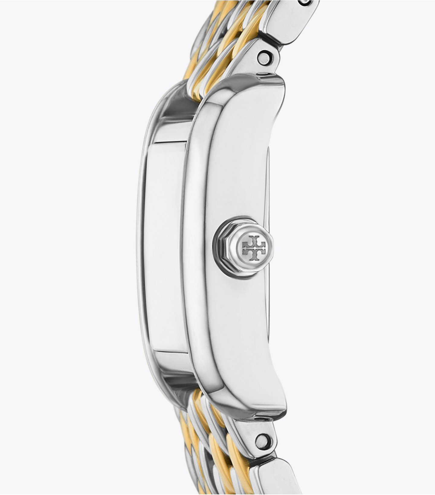 小巧设计焕新演绎优雅几何形腕表。Eleanor 迷你腕表采用长方形表壳搭配象牙色表盘。饰有经典链节表链,以金色和银色不锈钢匠心打造,可双圈佩戴。