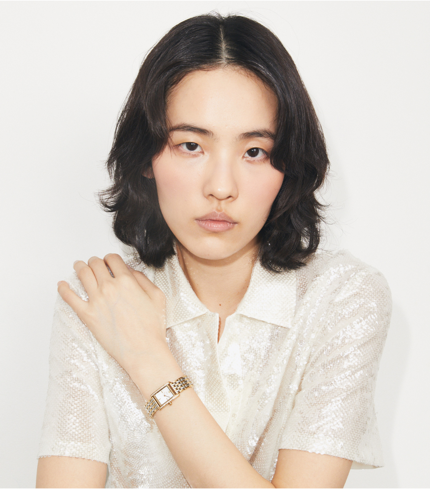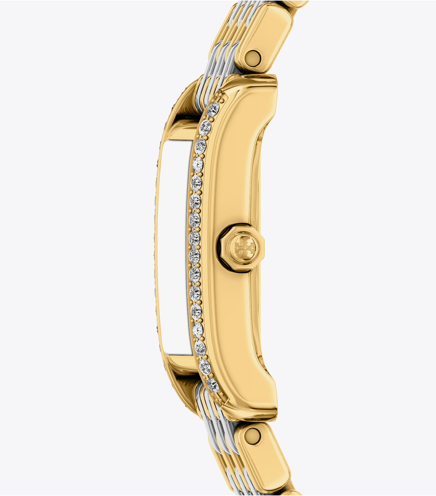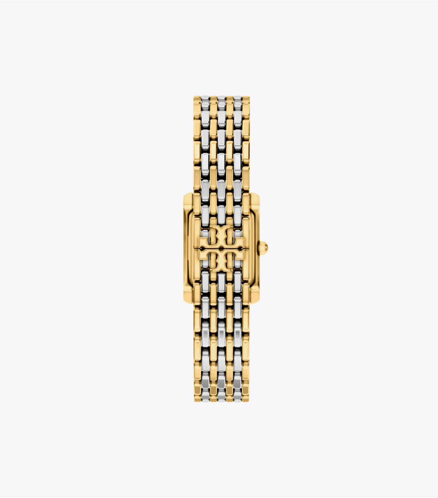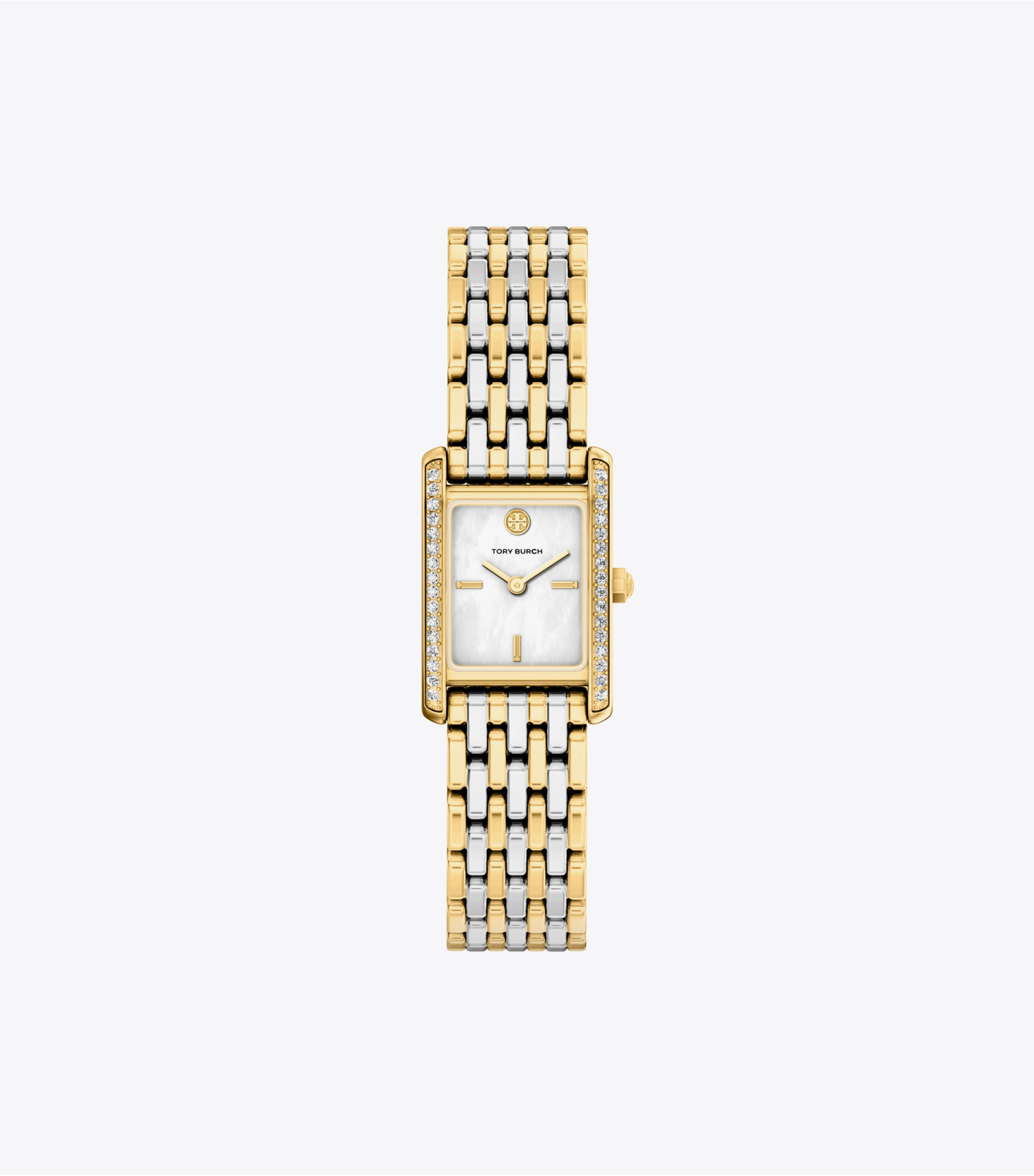 线条利落,优雅有型。Eleanor 小号腕表,饰以烫钻几何造型表壳,3、6、9点位置设有时标。配备金色与银色不锈钢链式表带,勾勒腕间精致格调。