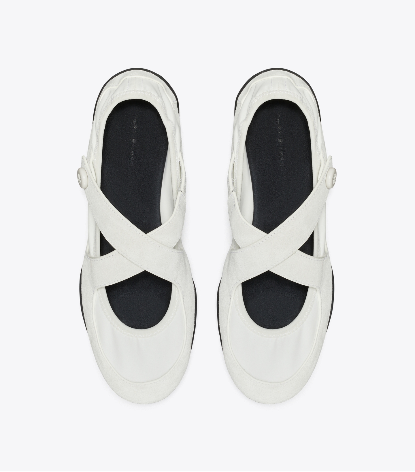 这款融汇现代风格的鞋款,设计灵感源自品牌经典手袋。Romy 运动玛丽珍鞋精选皮革打造。兼具运动鞋的舒适性与芭蕾平底鞋的轻盈感。配有交叉弹性系带,缀以固定纽扣式 Logo。